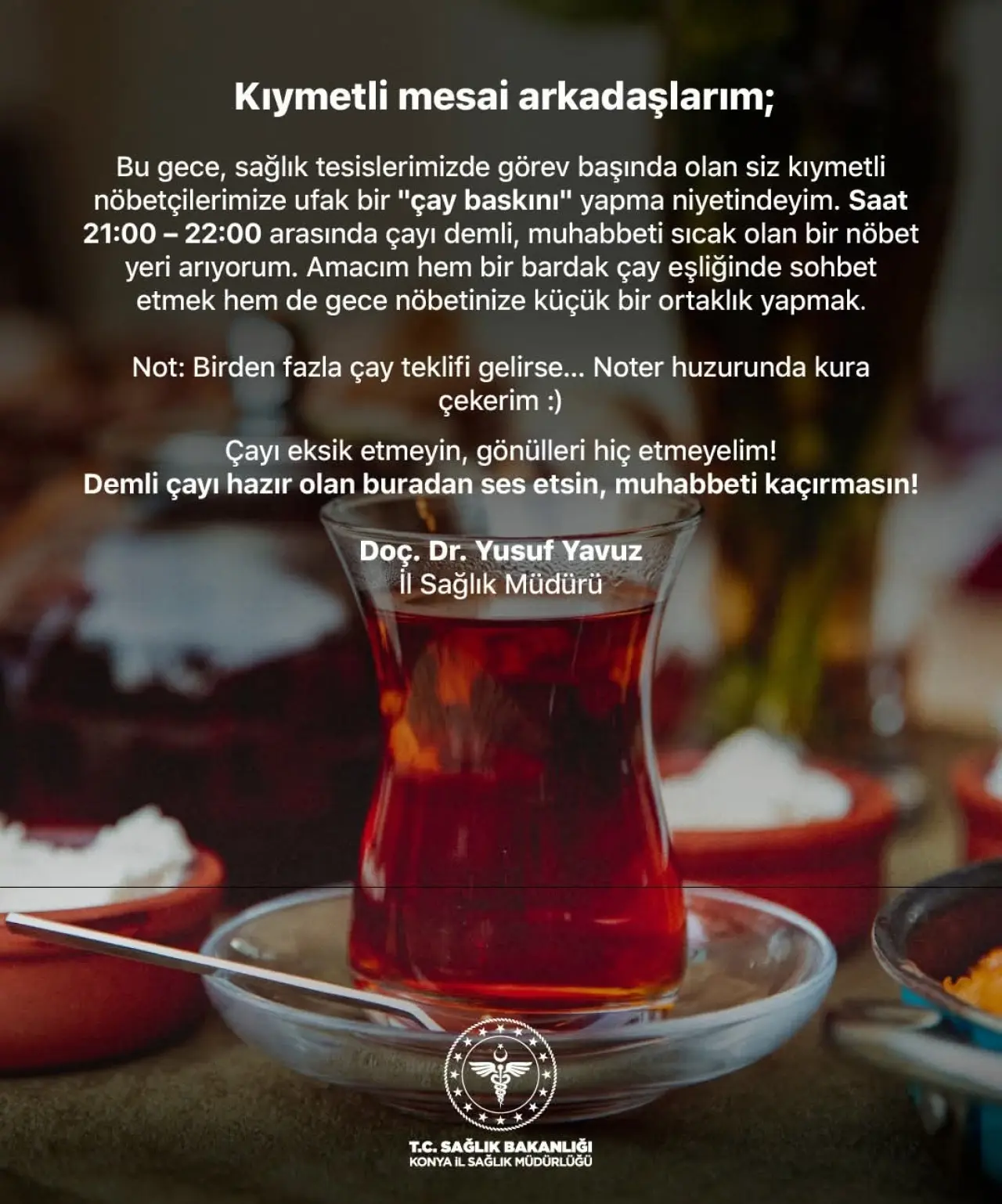 Müdür Yavuz, mesai arkadaşlarına hitaben yaptığı paylaşımda, “Bu gece, sağlık tesislerimizde görev başında olan kıymetli nöbetçilerimize ufak bir ‘çay baskını’ yapma niyetindeyim. Saat 21.00–22.00 arasında çayı demli, muhabbeti sıcak olan bir nöbet yeri arıyorum.” ifadelerini kullandı.