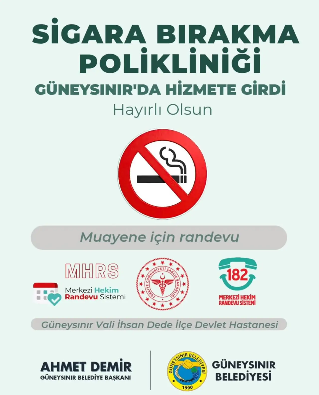 Güneysınır Belediye Başkanı Ahmet Demir, Vali İhsan Dede İlçe Devlet Hastanesi bünyesinde Sigara Bırakma Polikliniğinin hizmete başladığını duyurdu.