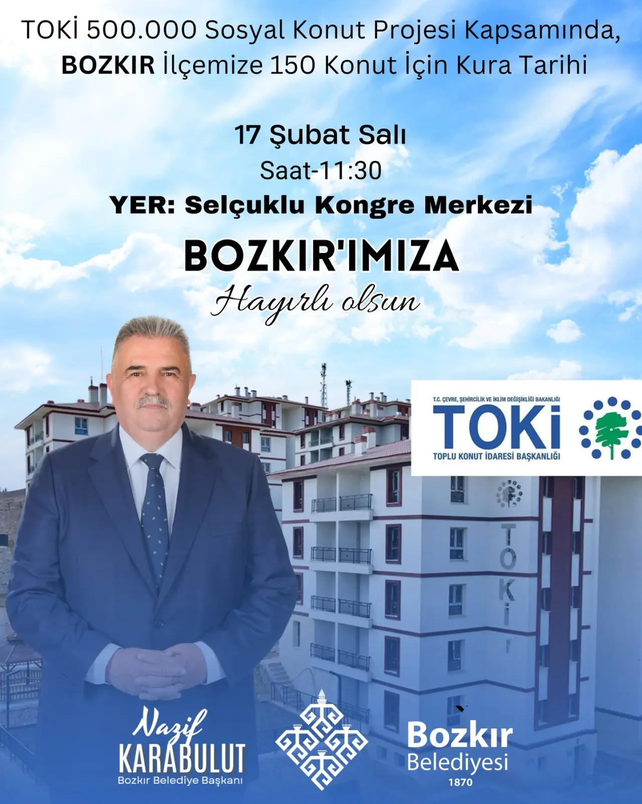 Bozkır’da yapılacak 150 konutun hak sahipleri, 17 Şubat Salı günü saat 11.30’da gerçekleştirilecek kura çekimiyle belirlenecek.