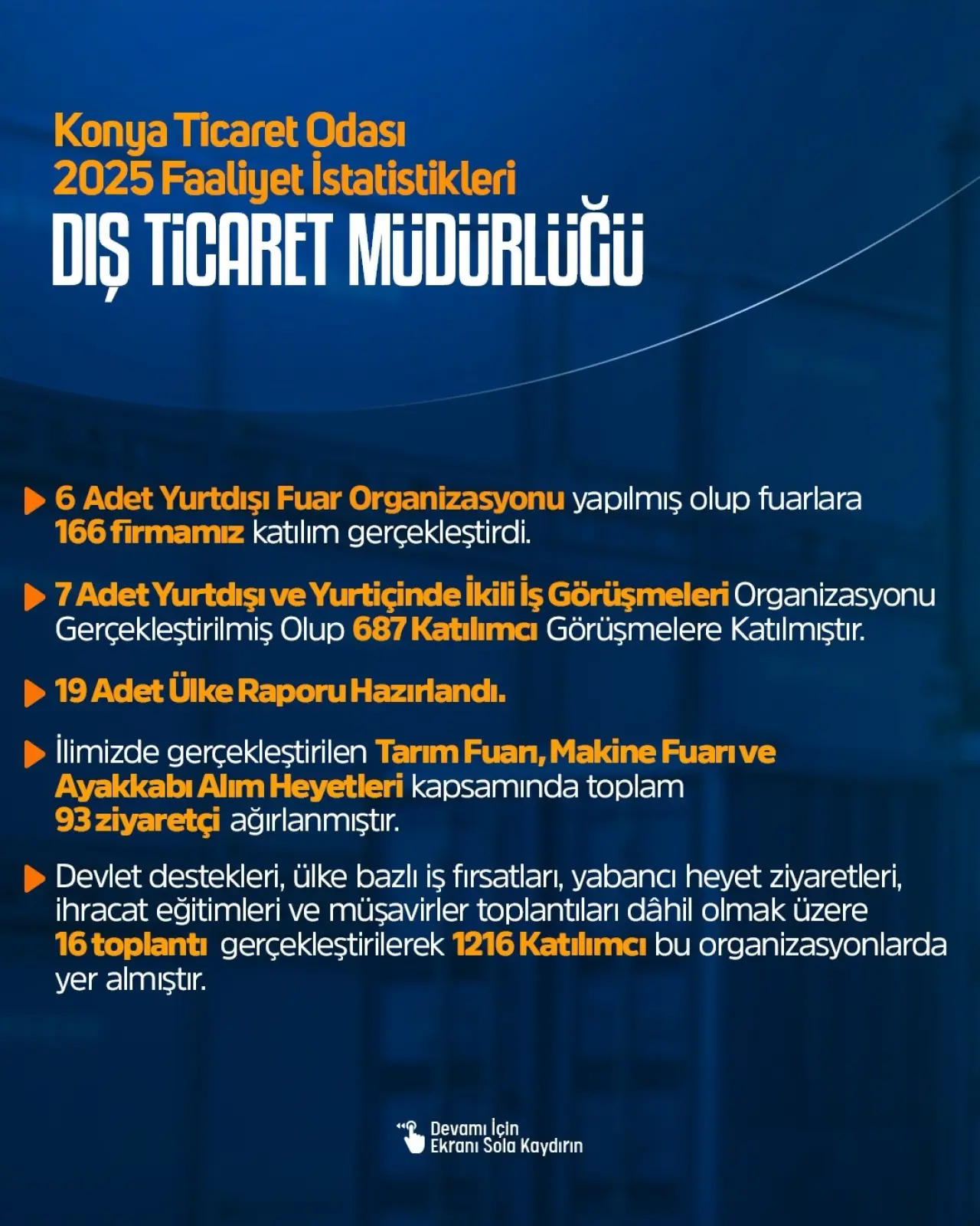 Konya Ticaret Odası Dış Ticaret Müdürlüğü tarafından 2025 yılı boyunca yürütülen çalışmalar kapsamında, üyelerin uluslararası pazarlara açılmasına yönelik önemli faaliyetlere imza atıldı. Yıl boyunca gerçekleştirilen organizasyonlarla Konya iş dünyası küresel ticaretle buluşturuldu.