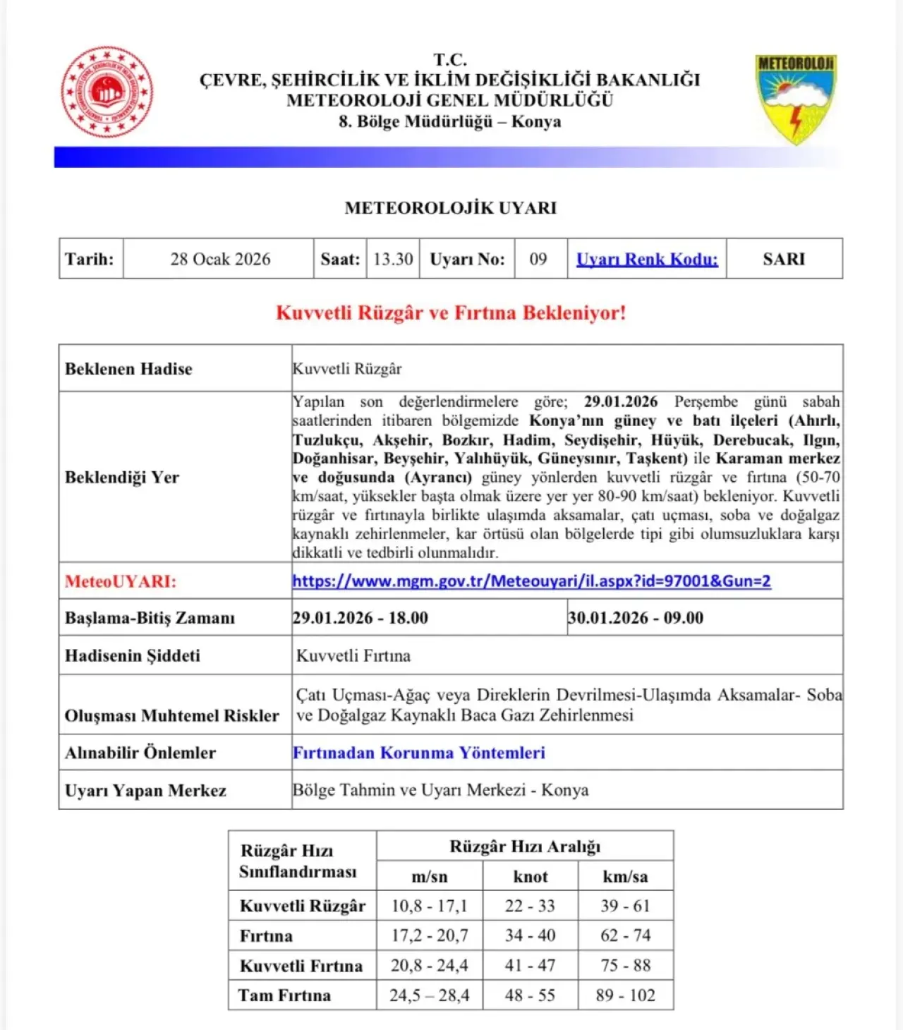 Meteoroloji 8. Bölge Müdürlüğü, Konya ve çevresi için kuvvetli rüzgar ve fırtına uyarısında bulundu. Resmî uyarı seviyesi “Sarı” olarak açıklanırken, beklenen rüzgar hızları nedeniyle oluşabilecek olumsuzluklara karşı vatandaşların tedbirli olması istendi.