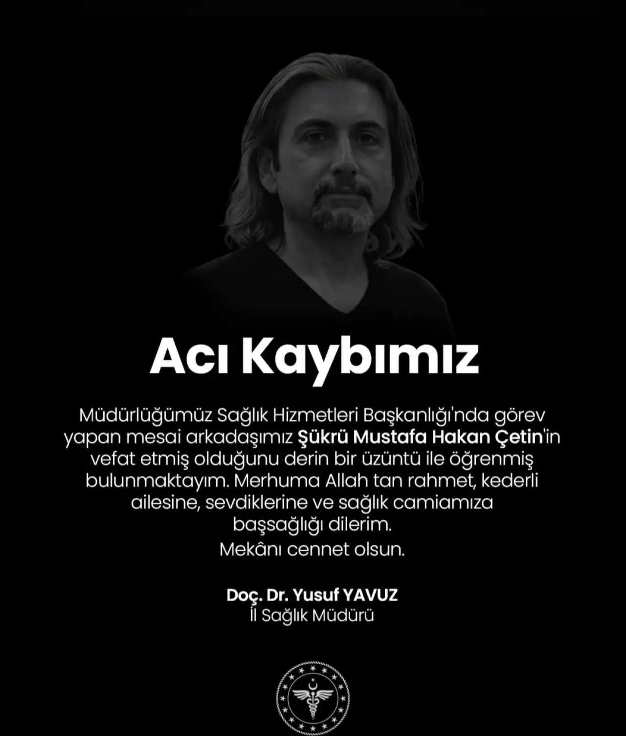 İl Sağlık Müdürü Doç. Dr. Yusuf Yavuz, Sağlık Hizmetleri Başkanlığı bünyesinde görev yapan Şükrü Mustafa Hakan Çetin’in vefat ettiğini duyurarak derin üzüntüsünü paylaştı.