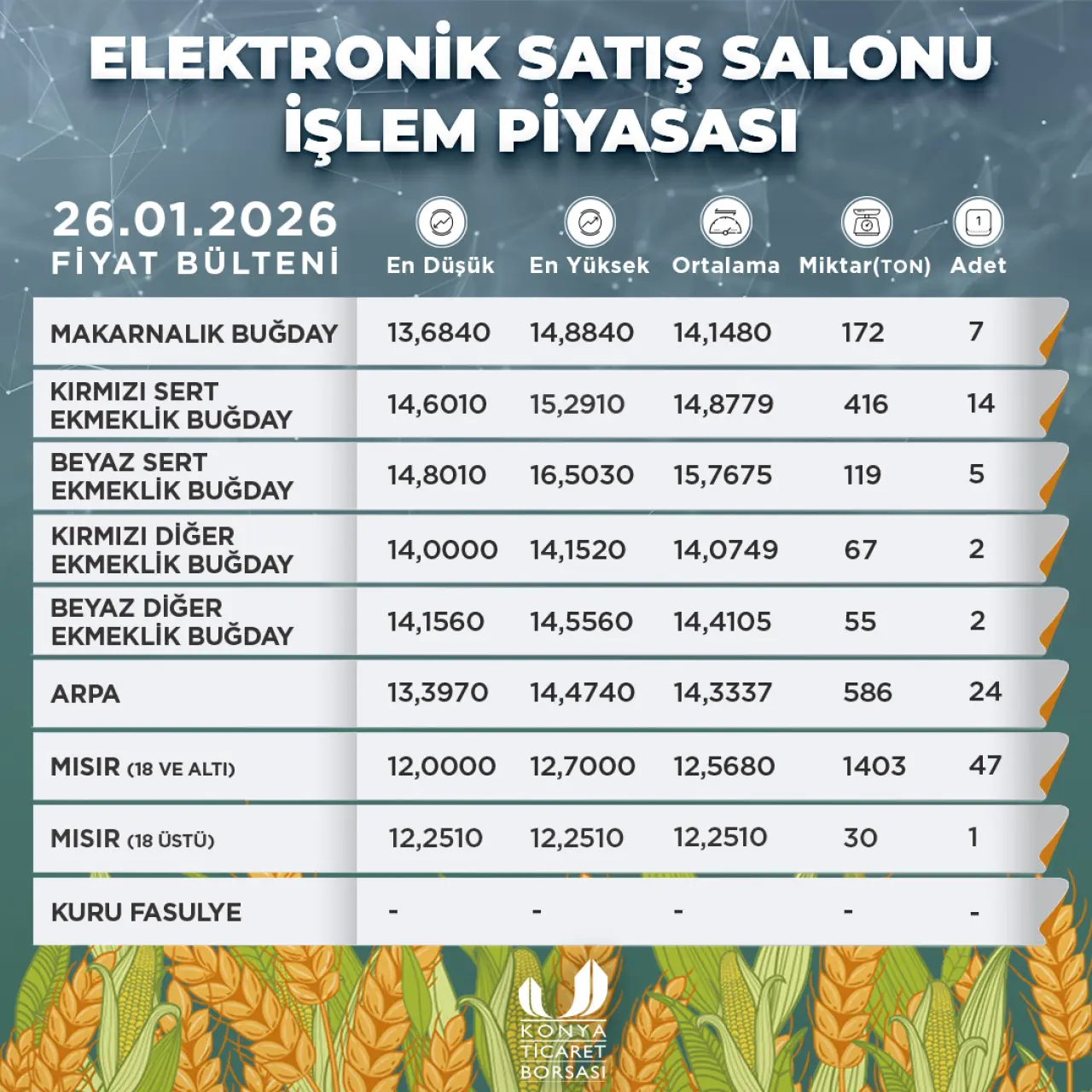Konya Ticaret Borsası (KTB), 26.01.2026 tarihli Elektronik Satış Salonu İşlem Piyasası Fiyat Bültenini kamuoyuyla paylaştı.