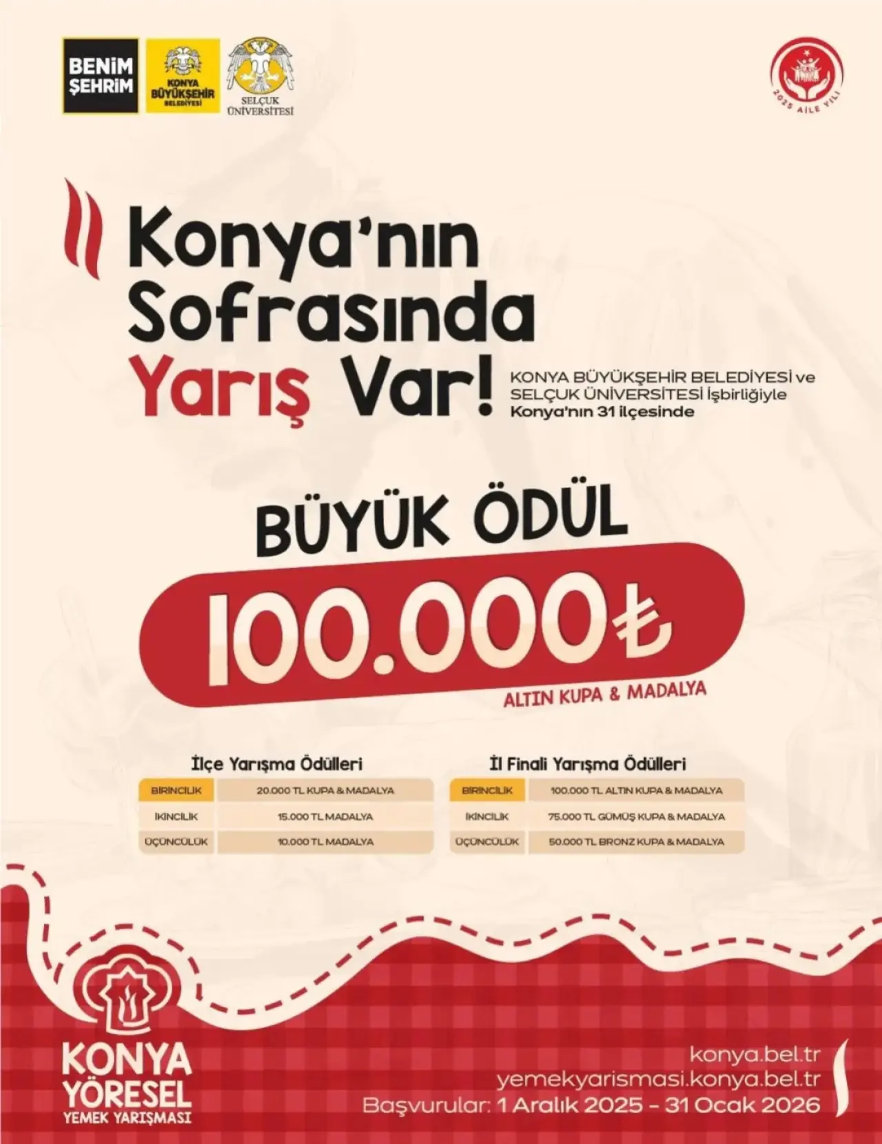 Başvuruların 1 Aralık 2025 – 31 Ocak 2026 tarihleri arasında alınacağı yarışmaya ilişkin detaylı bilgilere yemekyarismasi.konya.bel.tr adresi üzerinden ulaşılabilecek.
