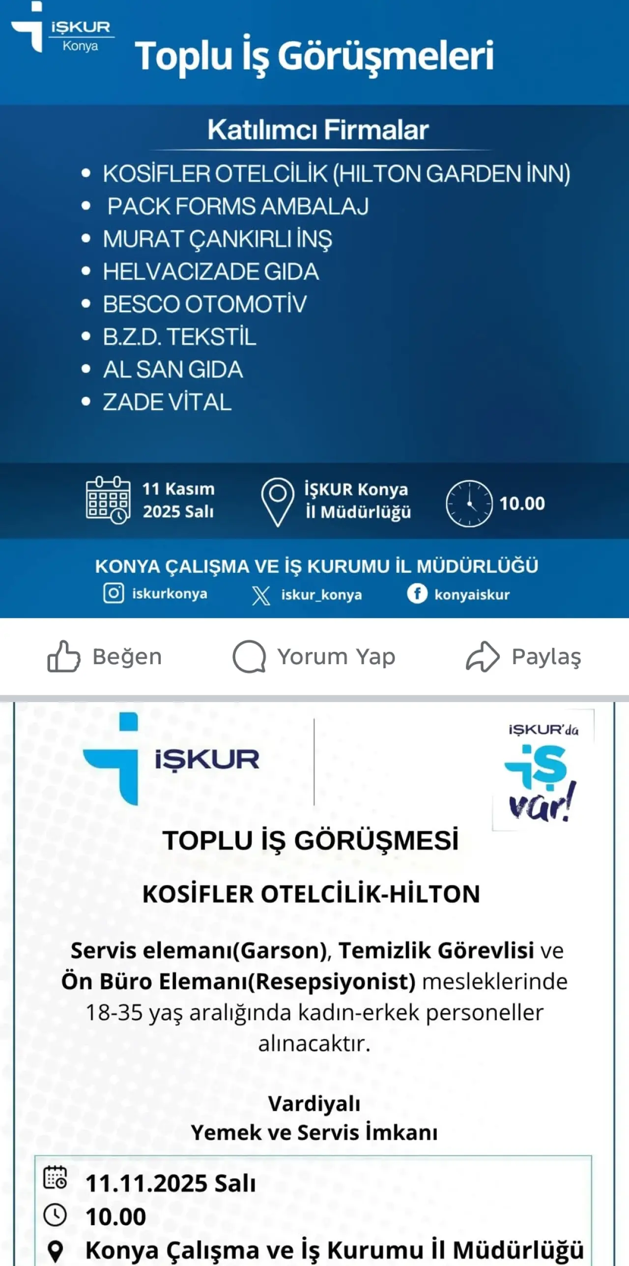 Konya Çalışma ve İş Kurumu İl Müdürlüğü, 11 Kasım 2025 Salı günü saat 10.00 – 12.00 arasında Toplu İş Görüşmeleri etkinliği gerçekleştirecek. Programa katılan iş arayanlar ve işverenler aynı çatı altında buluşturularak istihdama katkı sağlanacak.