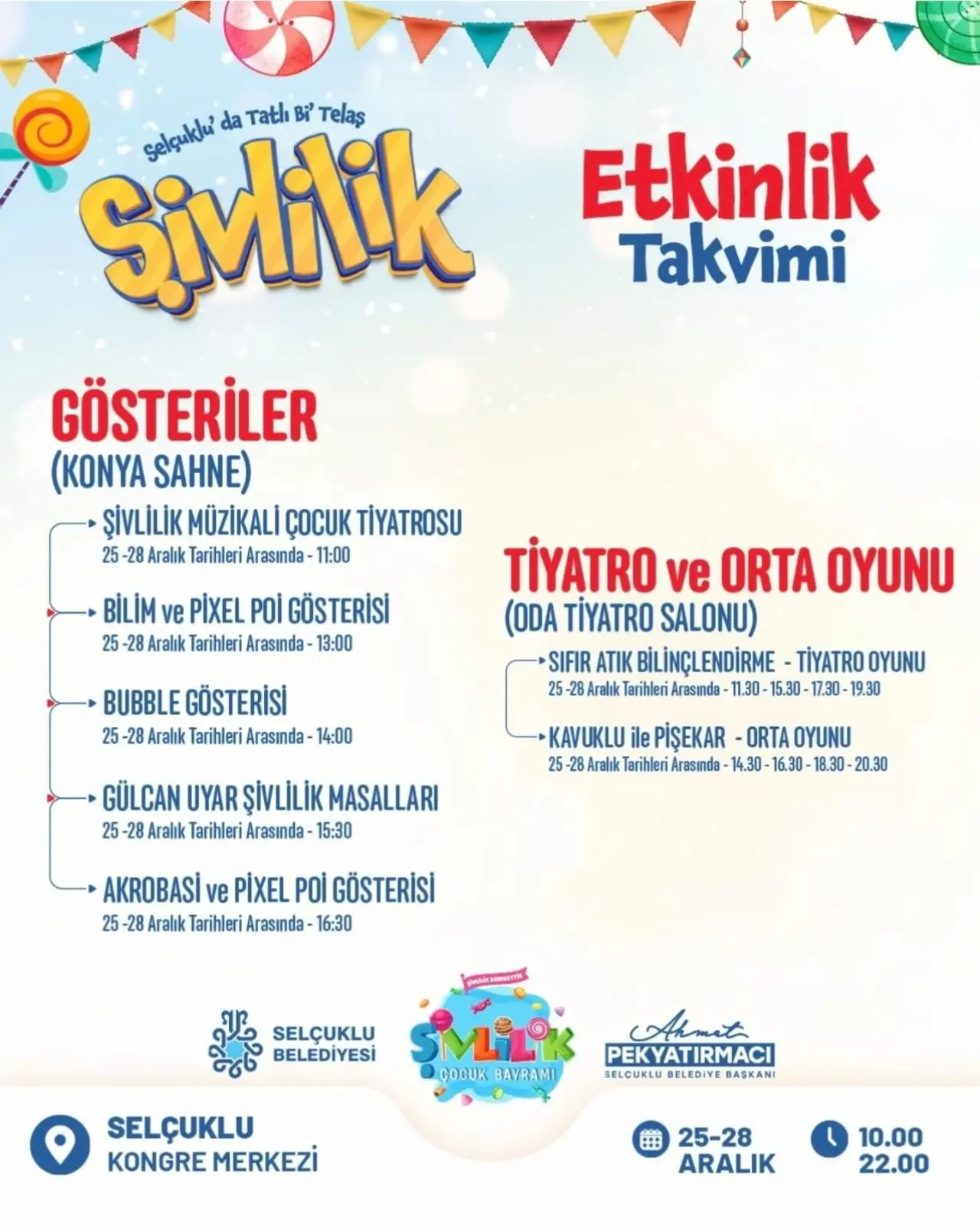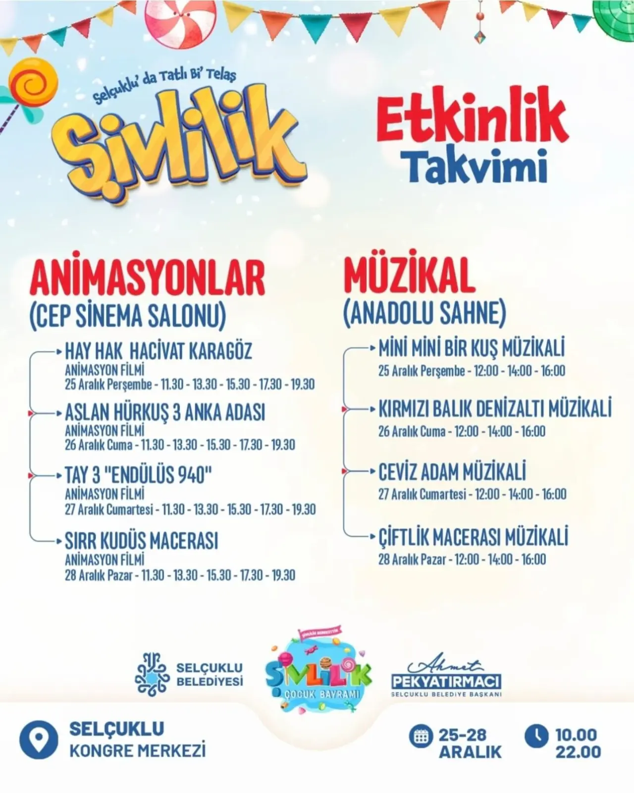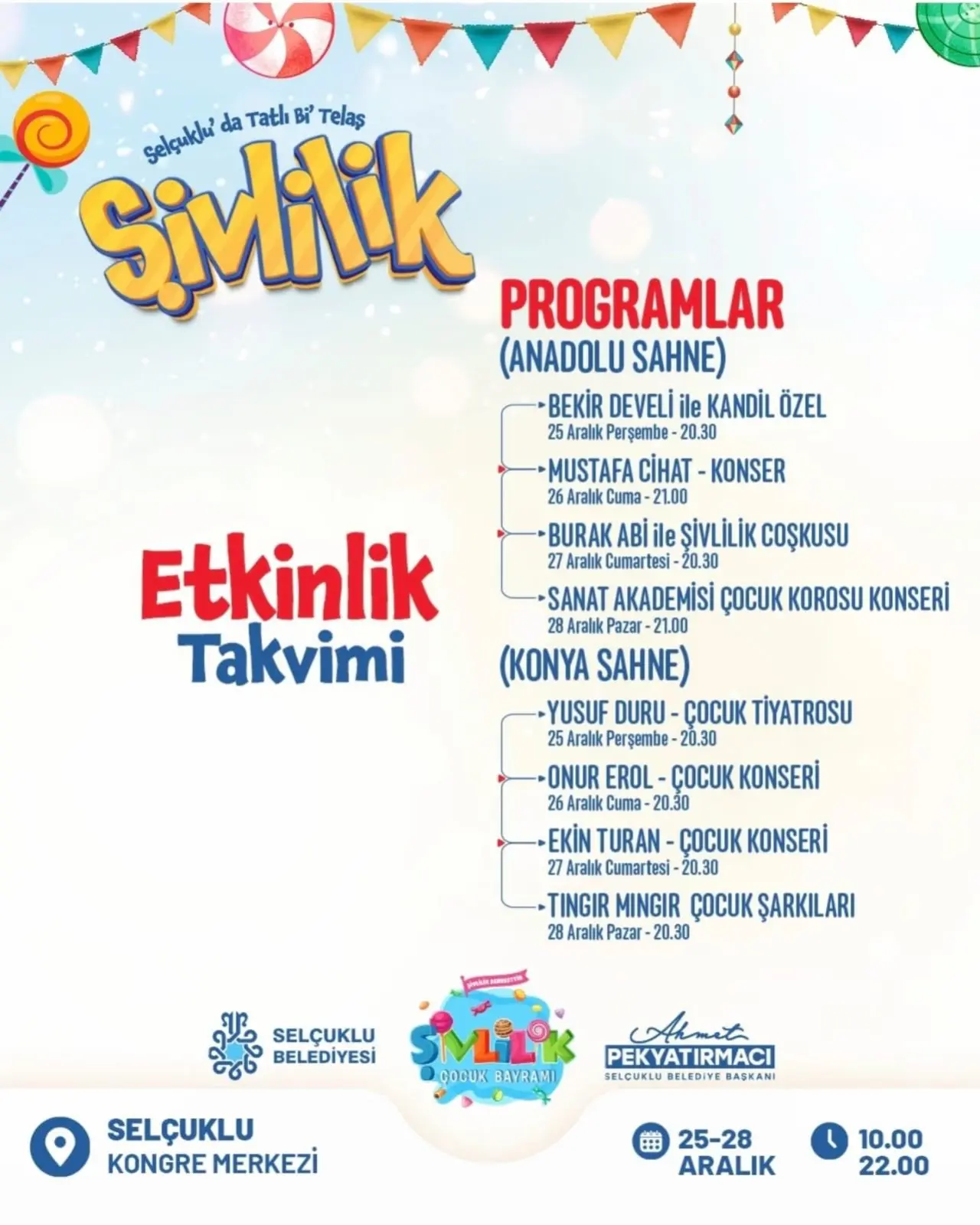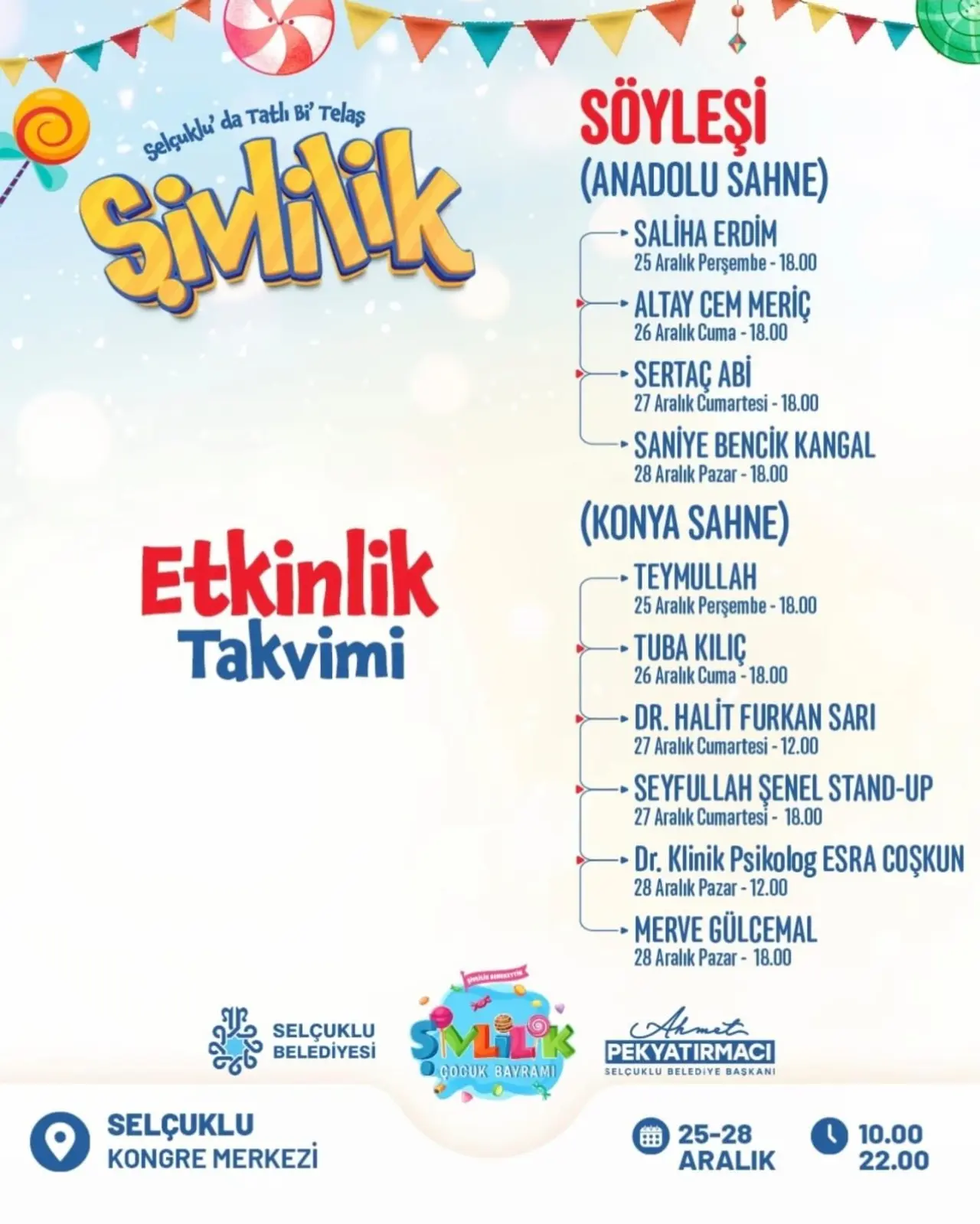 Selçuklu Kongre Merkezi’nde düzenlenecek etkinlikler, 25–28 Aralık 2025 tarihleri arasında her gün 10.00 – 22.00 saatleri arasında ziyaret edilebilecek. Dört gün boyunca sürecek organizasyonda çocuklar eğlenirken, aileler de bayram coşkusuna ortak olacak.