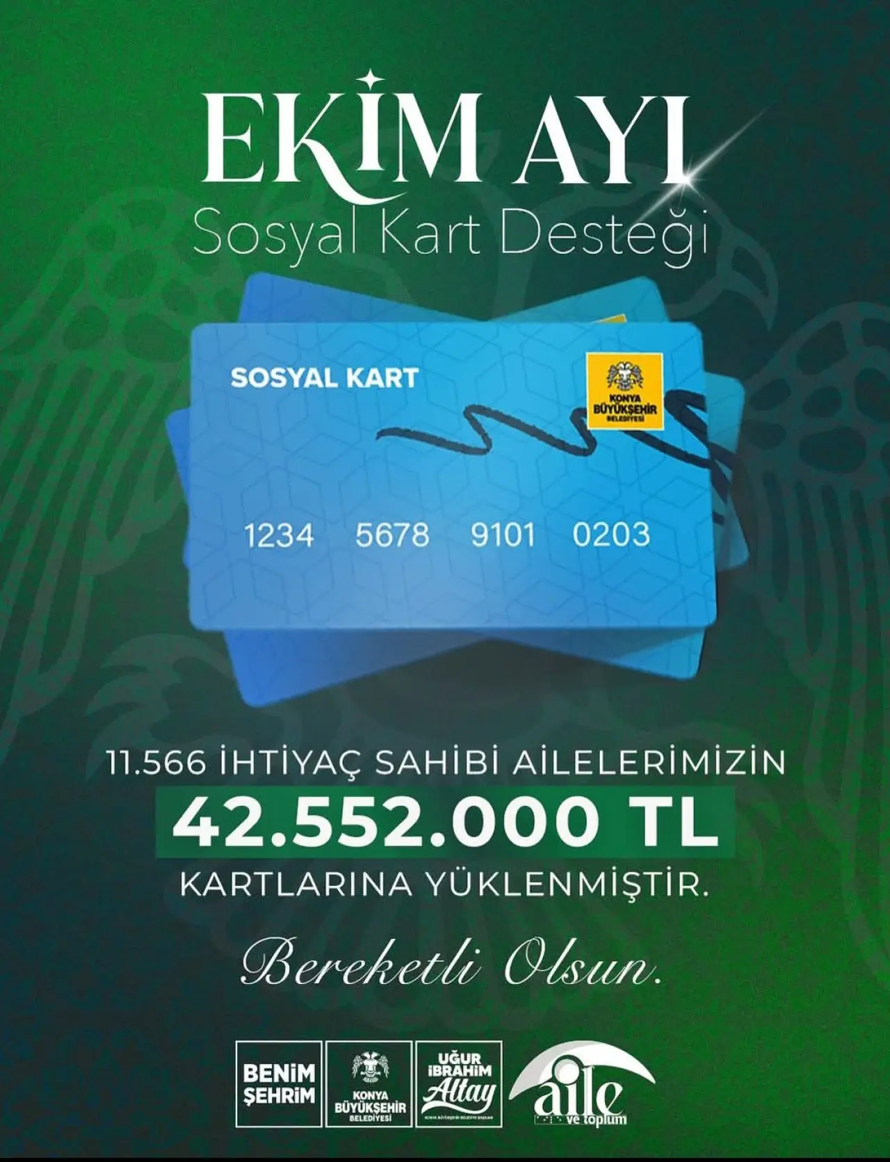 Bu ay toplam 11.566 aileye ulaşan destek kapsamında 42 milyon 552 bin lira yardım sağlandı. Başkan Altay, yaptığı paylaşımda, "Rabbim, bereketi ve huzuru tüm hanelerimize daim kılsın" ifadelerine yer verdi.