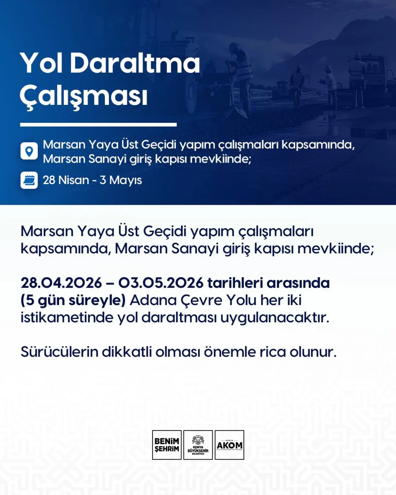 Konya AKOM’dan sürücülere önemli uyarı geldi. Marsan Yaya Üst Geçidi yapım çalışmaları kapsamında Adana Çevre Yolu’nda her iki yönde geçici yol daraltması uygulanacağı duyuruldu.