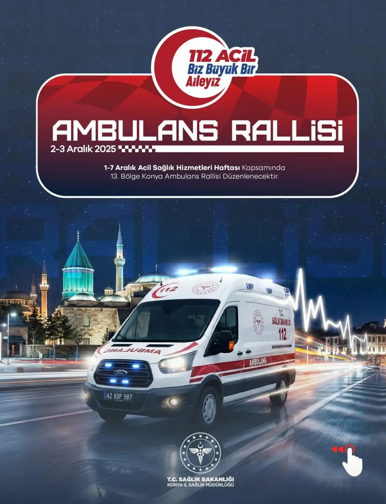 1–7 Aralık Acil Sağlık Hizmetleri Haftası kapsamında Konya İl Sağlık Müdürlüğü tarafından 13. Bölge Konya Ambulans Rallisi düzenlenecek. Acil sağlık ekiplerinin bilgi, beceri ve reflekslerini geliştirmeyi amaçlayan yarışma, 2–3 Aralık 2025 tarihlerinde gerçekleştirilecek.