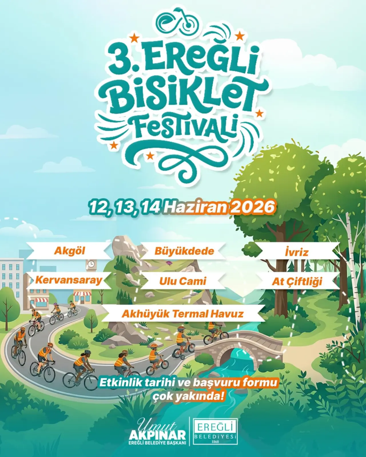 Belediyeden yapılan duyuruya göre, 3. Bisiklet Festivali 12-13-14 Haziran 2026 tarihlerinde gerçekleştirilecek. Her yıl yoğun katılımla düzenlenen festival, bu yıl da doğa ve spor tutkunlarını bir araya getirmeye hazırlanıyor.