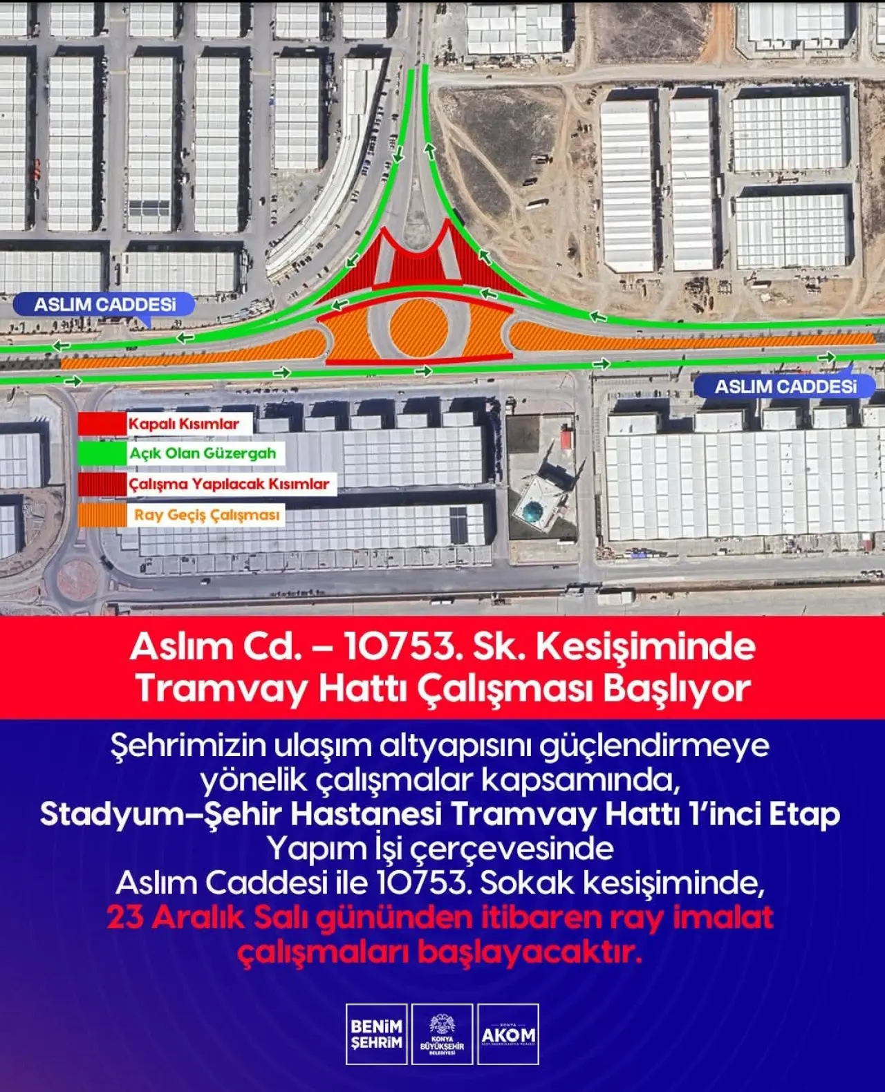Konya AKOM tarafından yapılan açıklamaya göre, 23 Aralık Salı gününden itibaren başlayacak çalışmalar süresince Aslım Caddesi güzergâhında trafik akışı kontrollü olarak sağlanacak. Çalışmaların güvenli bir şekilde yürütülebilmesi amacıyla 10753. Sokak kesişimi geçici olarak trafiğe kapalı olacak.