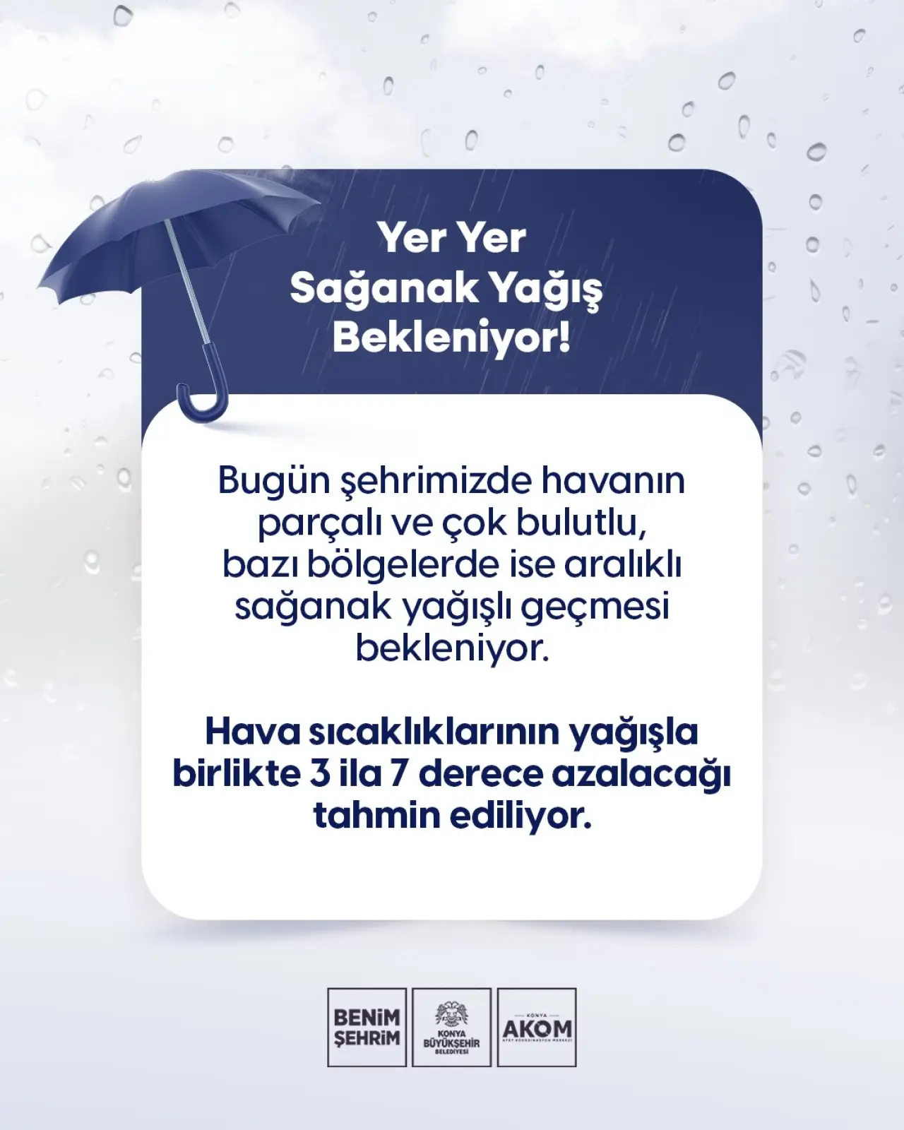 KONYA AKOM, ani sağanaklara bağlı olarak oluşabilecek su baskını, ulaşımda aksamalar, kısa süreli kuvvetli rüzgar gibi olumsuzluklara karşı vatandaşların dikkatli ve tedbirli olmalarını önemle hatırlattı.