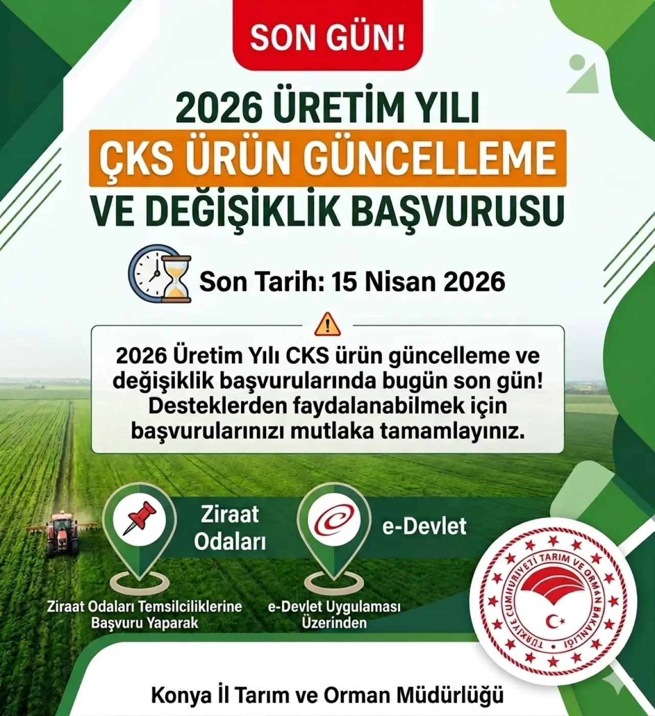 Konya genelinde 2026 üretim yılına ilişkin Çiftçi Kayıt Sistemi (ÇKS) ürün güncelleme ve değişiklik başvuruları için son gün uyarısı yapıldı.