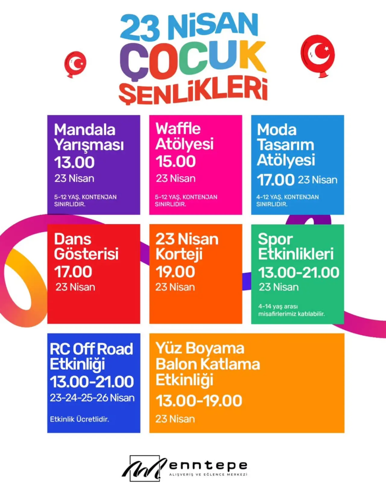 Enntepe AVM, 23 Nisan Ulusal Egemenlik ve Çocuk Bayramı’nı dopdolu etkinlik programıyla kutlamaya hazırlanıyor. Çocuklara özel hazırlanan renkli organizasyonlarda, gün boyunca eğlence ve neşe bir arada yaşanacak.
