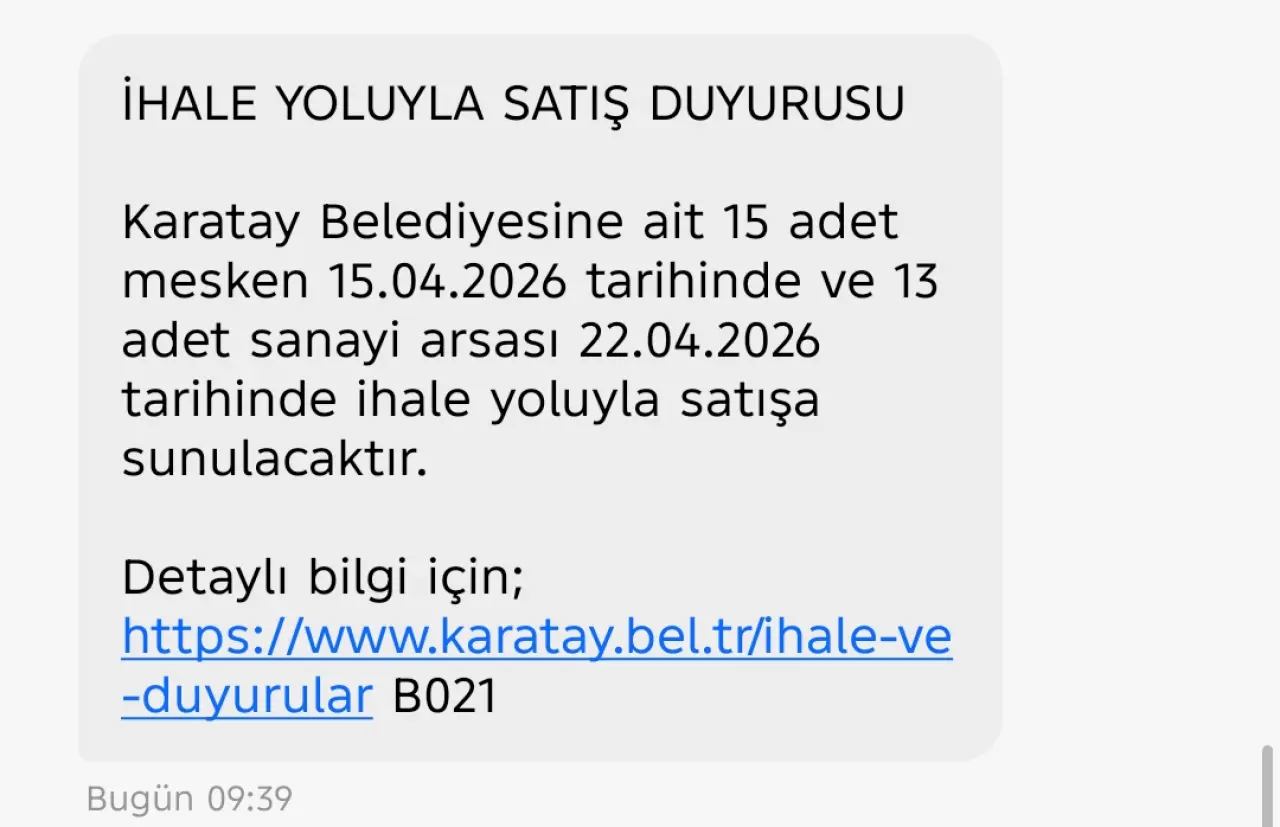 Detaylı bilgi ve ihale şartnamesi için Karatay Belediyesi İhale ve Duyurular sayfasının ziyaret edilebileceği bildirildi.