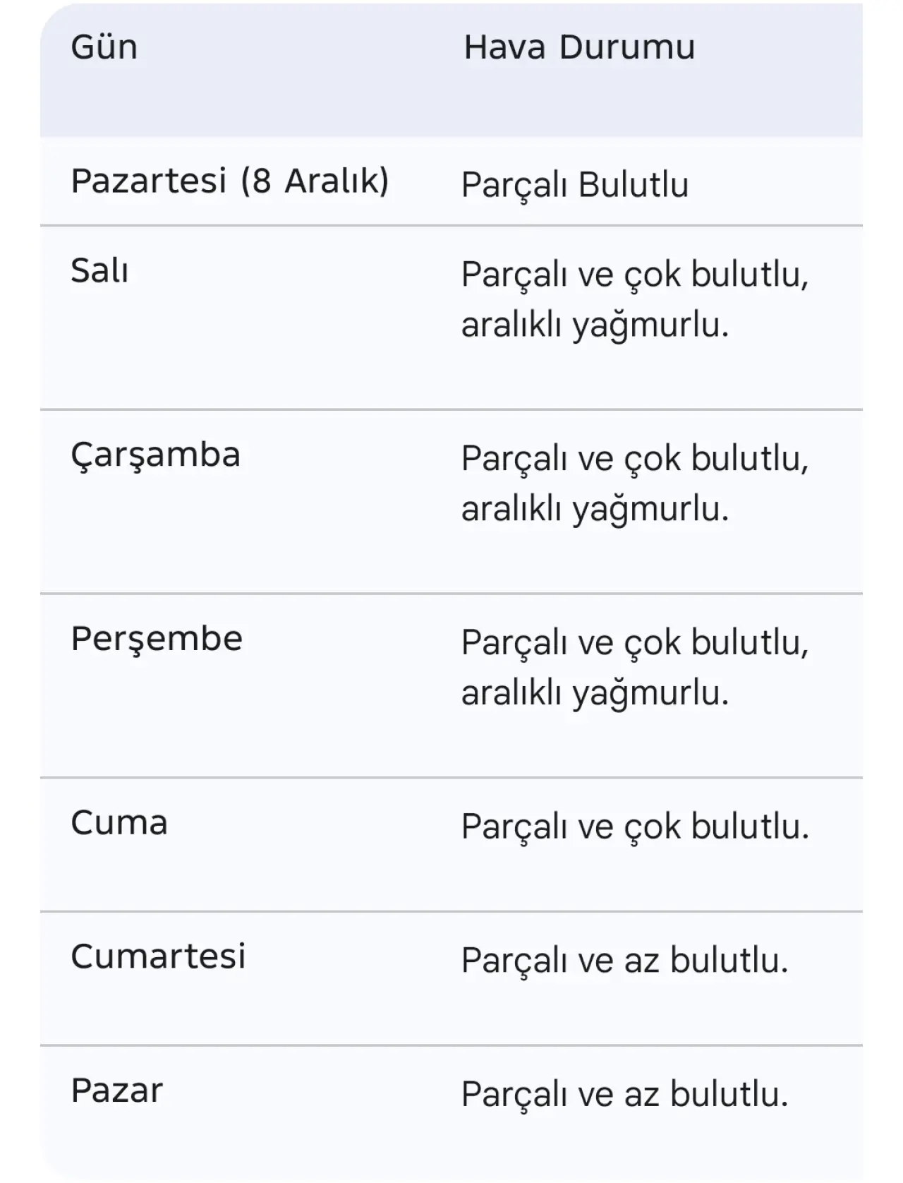 Konya Büyükşehir Belediyesi ve AKOM'un yayınladığı, 8 Aralık Pazartesi günü başlayan haftalık hava durumu tahmini aşağıdadır: