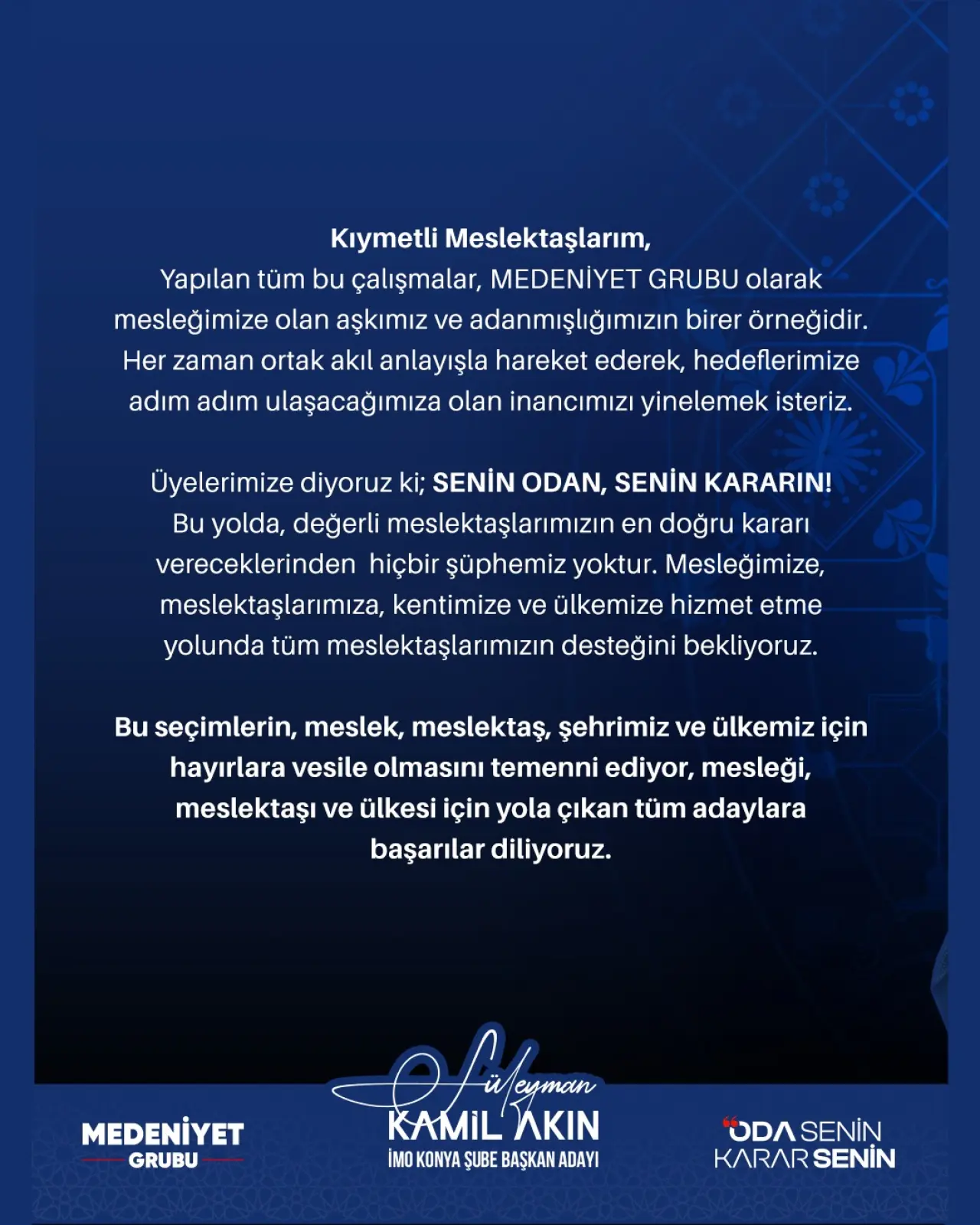 “SENİN ODAN, SENİN KARARIN!” sözleriyle üyelere net bir mesaj veren Akın, meslektaşların bu süreçte en doğru tercihi yapacağına olan güvenlerinin sonsuz olduğunu vurguladı.
