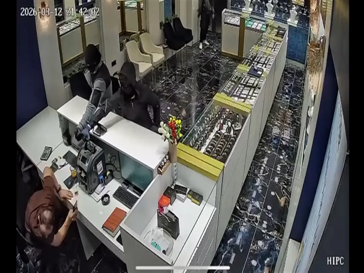 Olay anı, iş yerinin güvenlik kamerası tarafından kaydedildi. Görüntülerde, iş yerine giren maskeli 3 şüphelinin, tezgahın arkasında oturan iş yeri sahibi Enes Tok'a biber gazı sıktığı yer alıyor. Görüntülere göre; Tok, iş yerinin arka bölümüne kaçtıktan sonra eline geçirdiği objeleri, soyguncuların üzerine fırlatıyor. Elinde tabanca olan bir soyguncu da tezgahın üzerindeki çiçeğin saksını Tok'a fırlatıyor. Bu sırada soygunculardan biri de vitrine yönelip, bilezikleri alıyor. Tok, dükkandaki çay kazanı ve diğer objeleri fırlatarak, soyguncuları uzaklaştırıyor.