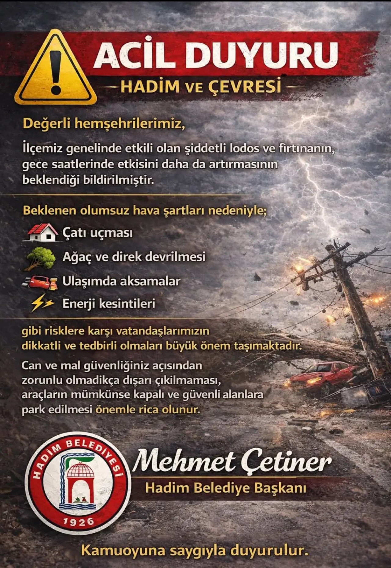 Hadim Belediye Başkanı Mehmet Çetiner, ilçede etkili olan şiddetli lodos ve fırtına nedeniyle vatandaşlara önemli uyarılarda bulundu. Meteorolojik değerlendirmelere göre, gece saatlerinde fırtınanın etkisini daha da artırmasının beklendiği bildirildi.