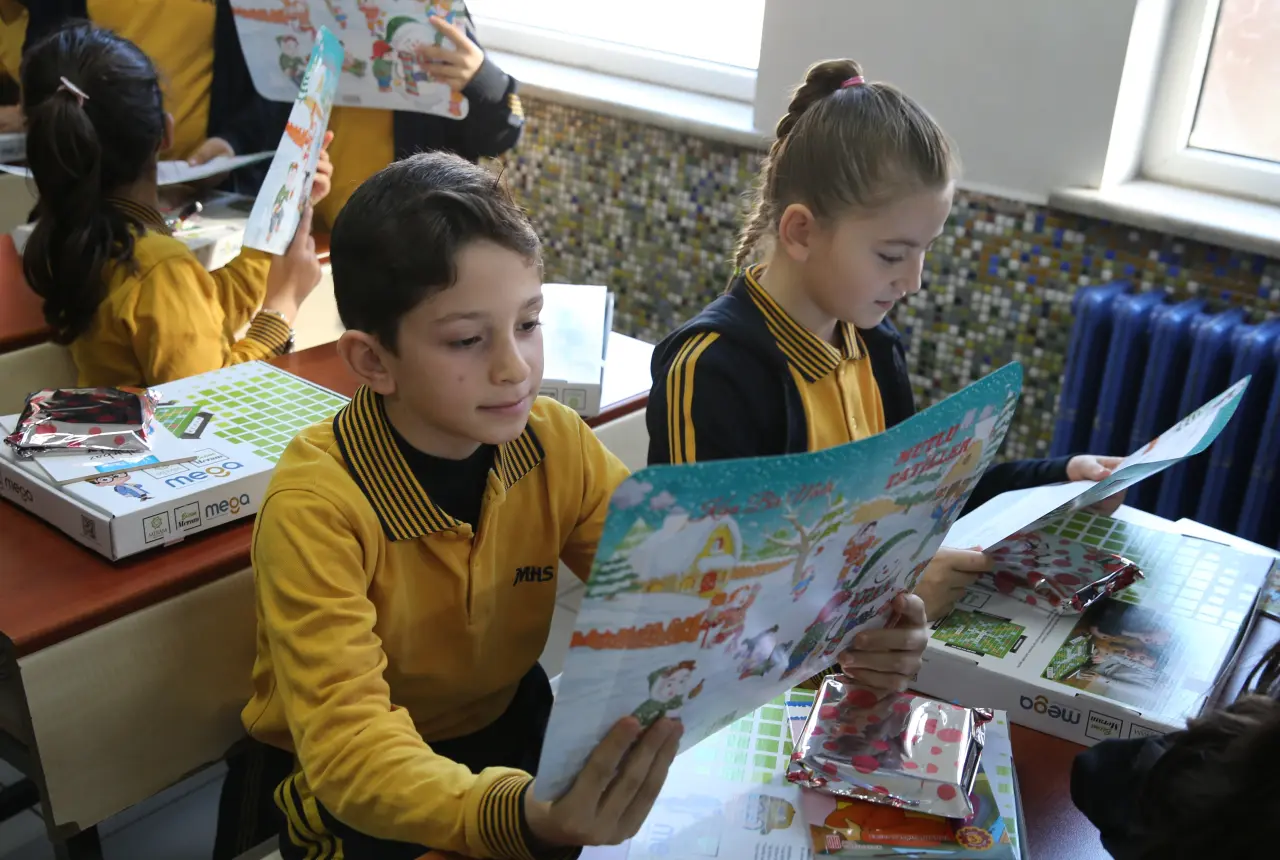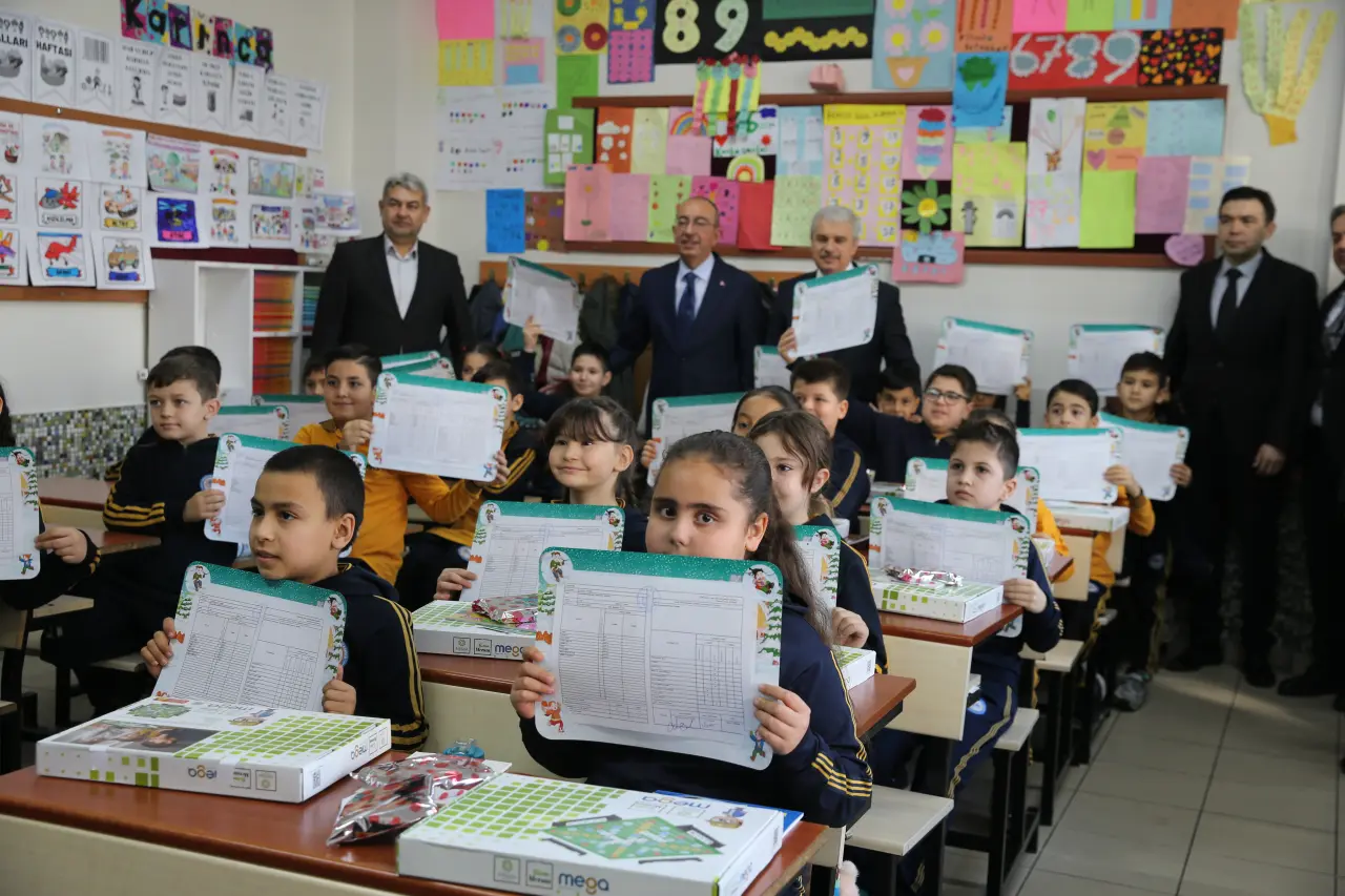 Akın ve beraberindekiler, karnelerini dağıttıkları öğrencilere başarılar diledi, hediye verdi.