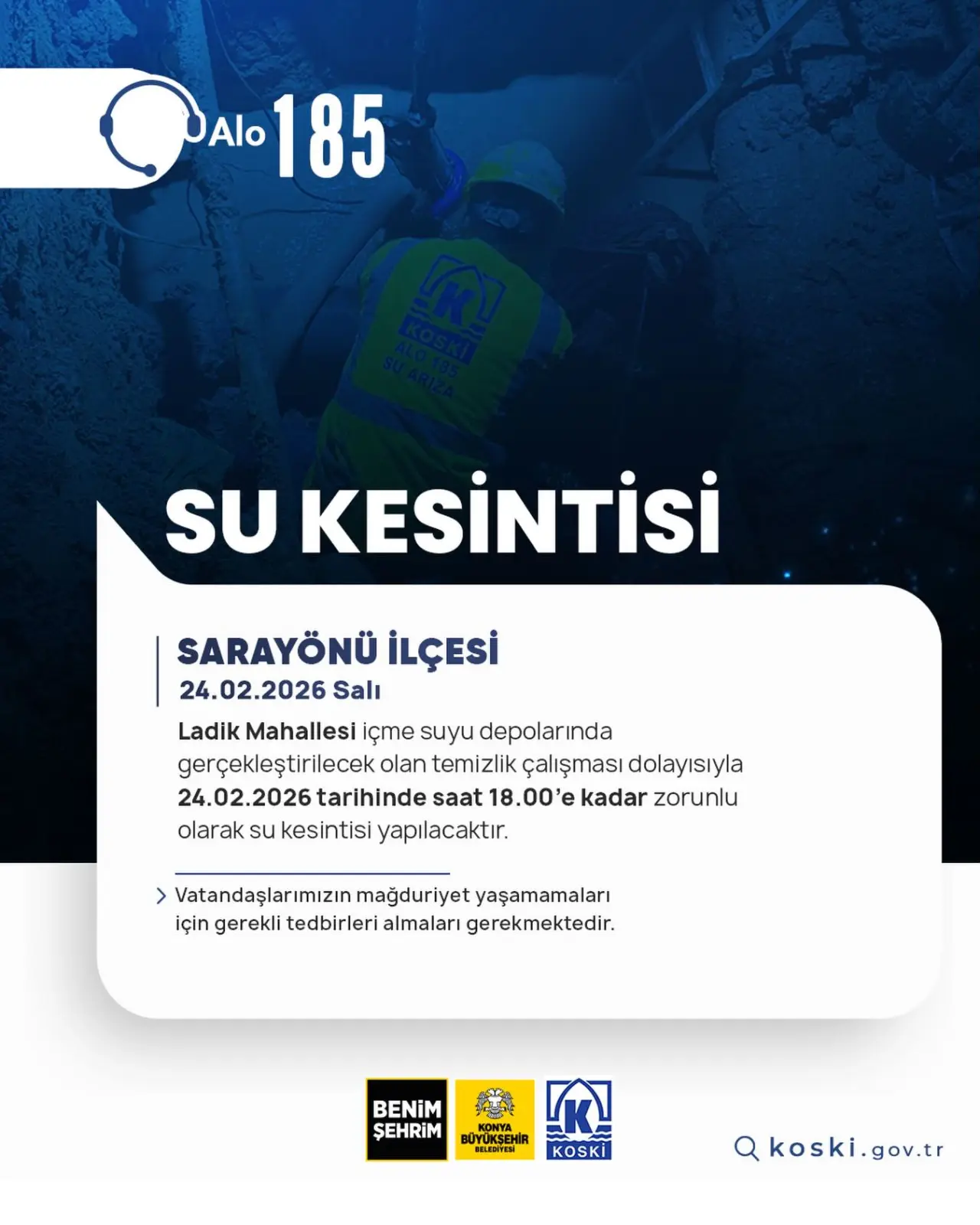 Konya Büyükşehir Belediyesi KOSKİ Genel Müdürlüğü tarafından yapılan açıklamaya göre, Sarayönü ilçesine bağlı Ladik Mahallesi’nde su depo temizliği çalışmaları nedeniyle planlı su kesintisi uygulanıyor.