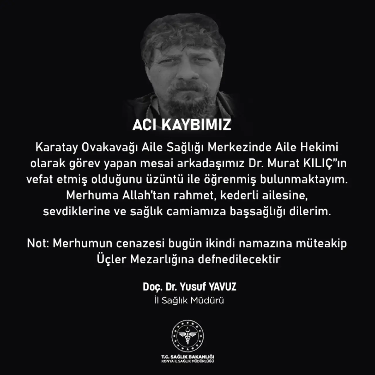 Karatay Ovakavağı Aile Sağlığı Merkezi’nde Aile Hekimi olarak görev yapan Dr. Murat Kılıç’ın vefat ettiği üzüntüyle öğrenildi. Acı kayıp dolayısıyla bir mesaj yayımlayan Konya İl Sağlık Müdürü Doç. Dr. Yusuf Yavuz, merhuma Allah’tan rahmet; ailesine, sevdiklerine ve sağlık camiasına başsağlığı dileklerini iletti.