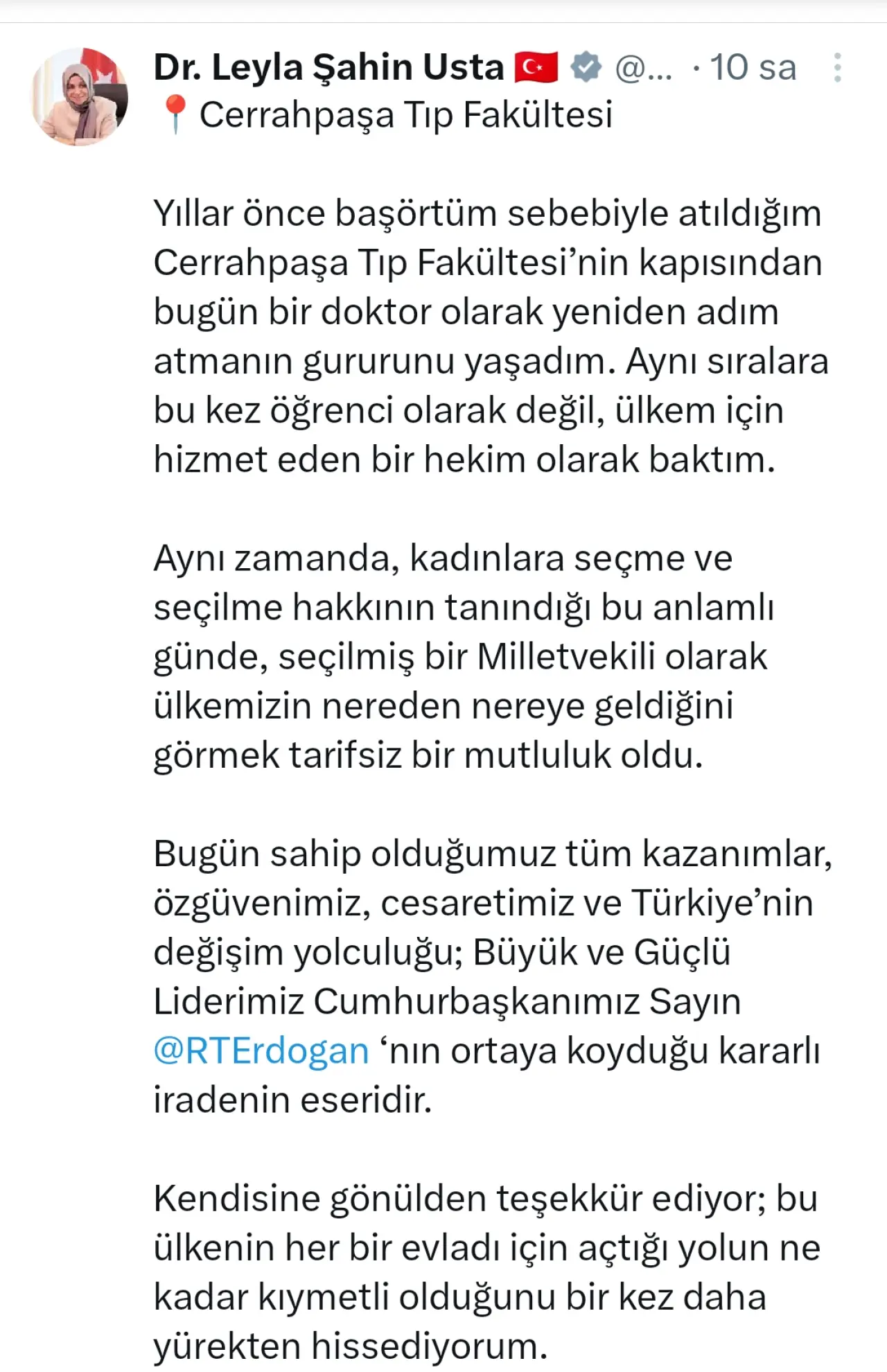 AK Parti Grup Başkanvekili ve Ankara Milletvekili Leyla Şahin Usta, yıllar önce başörtüsü sebebiyle öğrenimine devam edemediği Cerrahpaşa Tıp Fakültesi’ne bu kez bir hekim ve milletvekili olarak dönüş yaptı. Usta’nın paylaştığı bu anlamlı ziyaret, hem Türkiye’nin demokrasi ve özgürlük alanında kat ettiği mesafe hem de Konya’nın yetiştirdiği önemli bir ismin hikâyesi açısından büyük dikkat çekti.