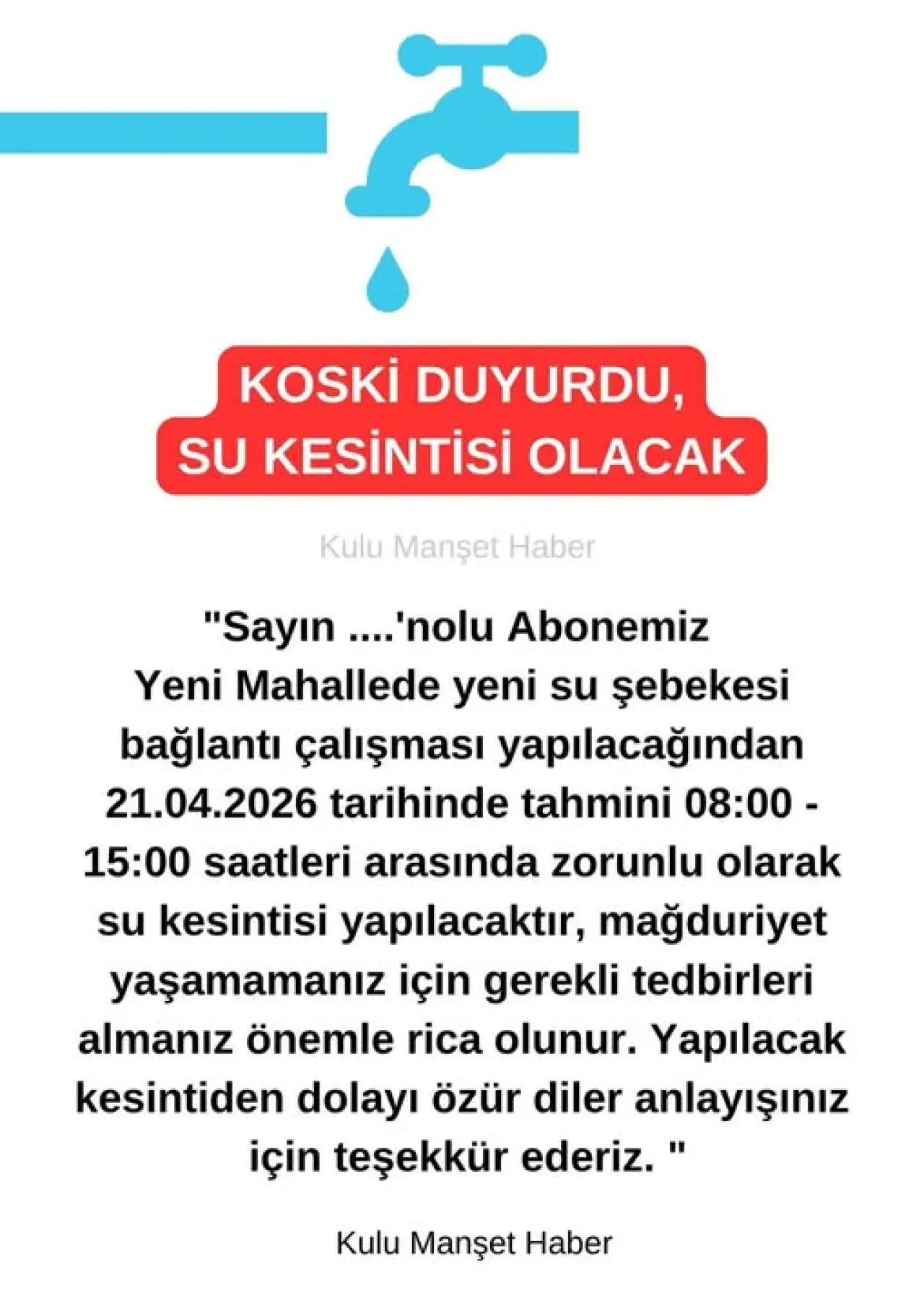 Kulu’da özellikle Yeni Mahalle sakinlerini yakından ilgilendiren kesinti süresince su kullanımına dikkat edilmesi ve ihtiyaçların önceden karşılanması önem taşıyor.