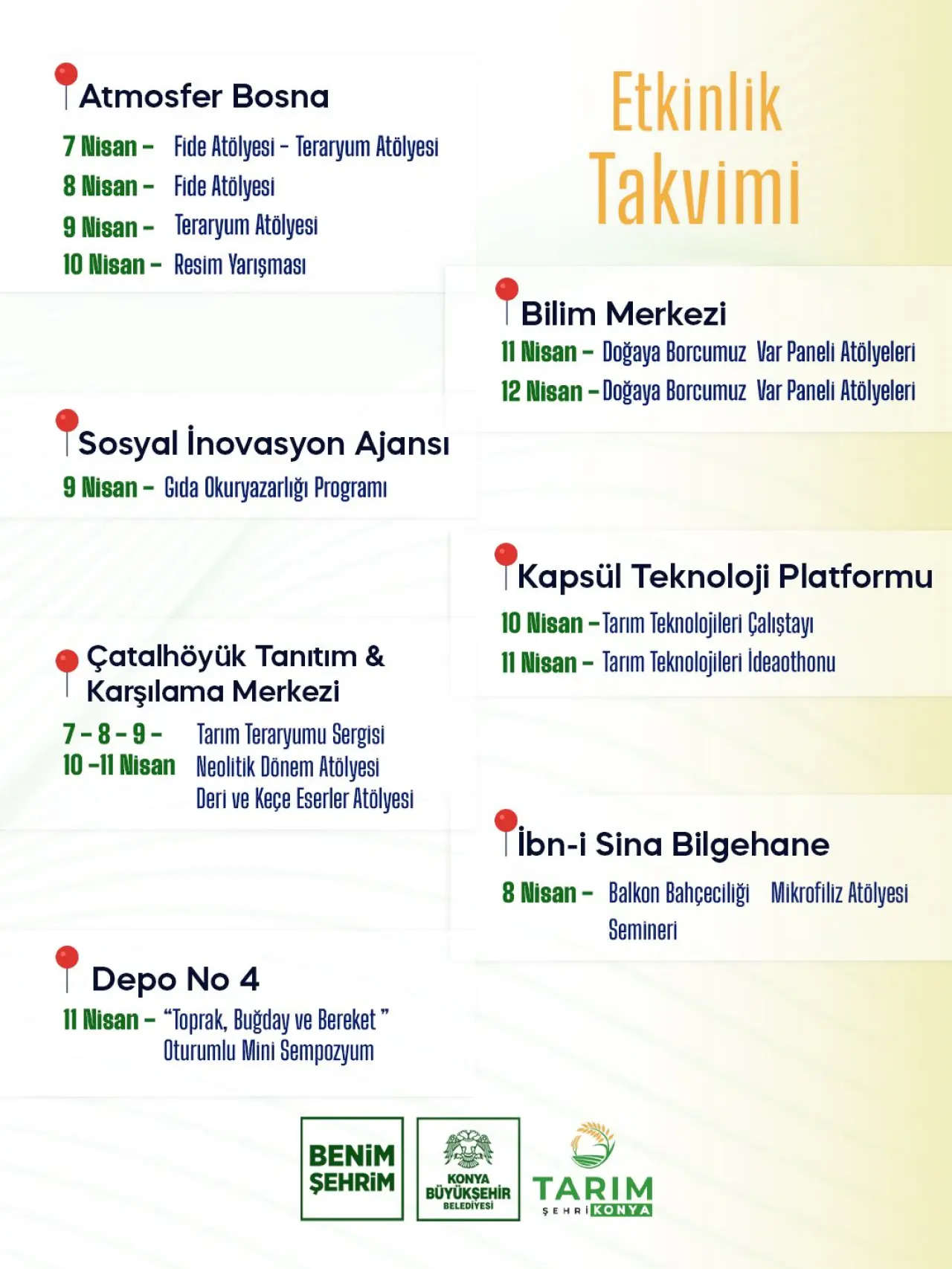 - 7–11 Nisan | Çatalhöyük Tanıtım Merkezi: Tarım Teraryumu Sergisi, Neolitik Dönem Atölyesi, Deri & Keçe Atölyesi