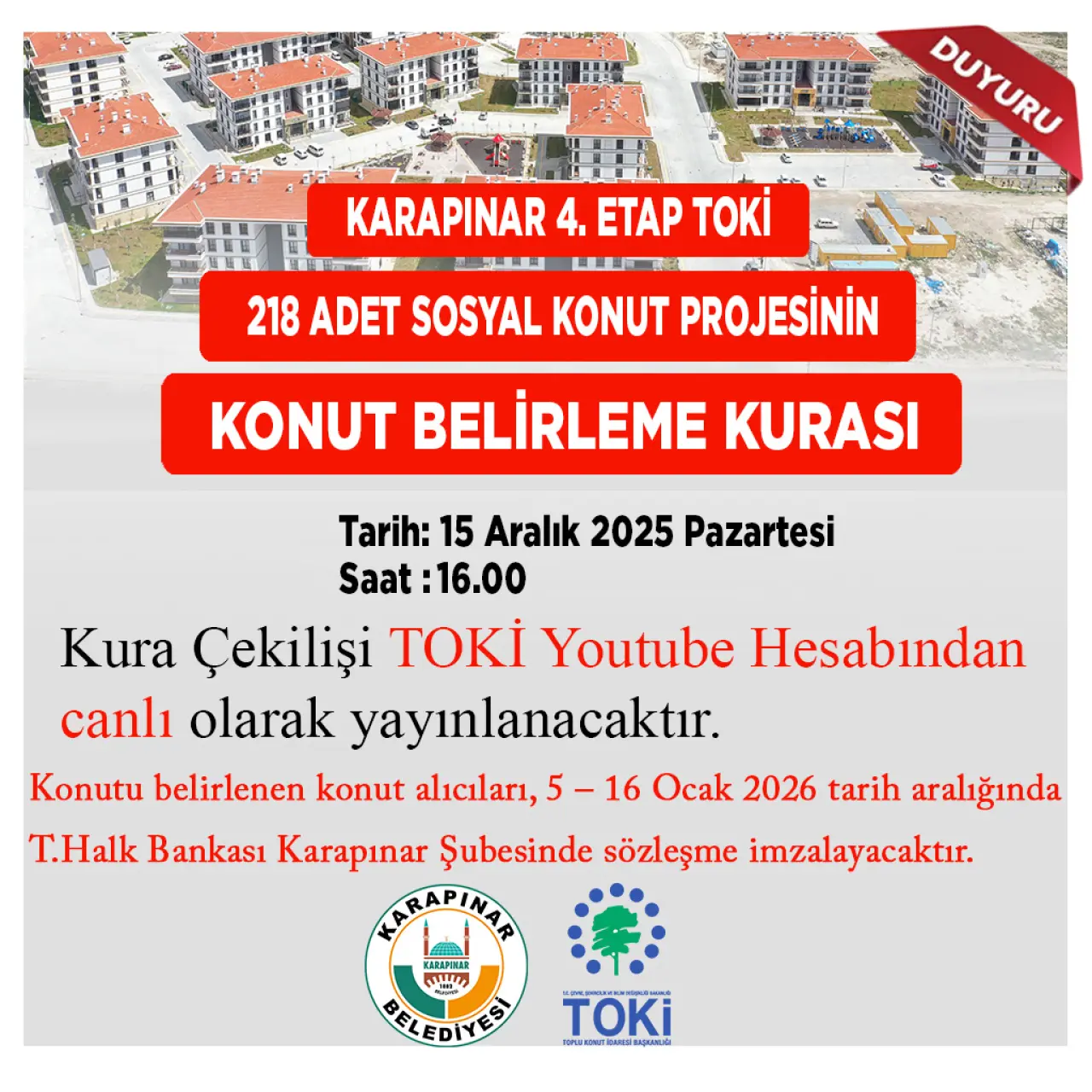 Kura sonucunda konutu belirlenen hak sahipleri, 5 – 16 Ocak 2026 tarihleri arasında T. Halk Bankası Karapınar Şubesinde sözleşme imzalama işlemlerini tamamlayabilecek.
