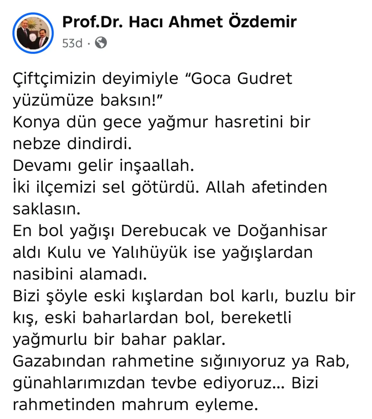 Milletvekili Özdemir, eski kış ve baharların bereketini hatırlatarak, yağışların bereketli ve verimli bir dönem getirmesi temennisinde bulundu. Paylaşımında, “Gazabından rahmetine sığınıyoruz ya Rab, günahlarımızdan tevbe ediyoruz… Bizi rahmetinden mahrum eyleme” sözlerine de yer verdi.