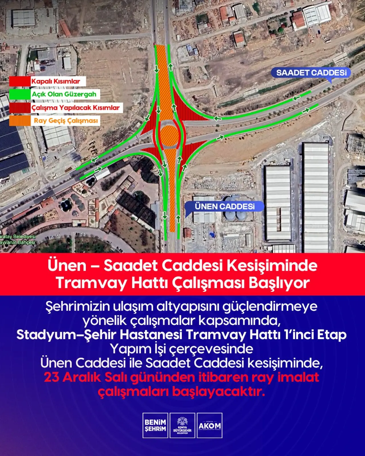 Konya AKOM’dan yapılan açıklamaya göre, 23 Aralık Salı gününden itibaren başlayacak çalışmalar süresince Ünen Caddesi güzergâhında trafik akışı kontrollü olarak sağlanacak, Saadet Caddesi kesişimi ise geçici olarak trafiğe kapalı olacak. Yetkililer, sürücülerin olası yoğunluklara karşı alternatif güzergâhları kullanmaları, trafik işaret ve yönlendirmelerine dikkat etmeleri konusunda uyarıda bulundu. Çalışmaların tamamlanmasıyla birlikte tramvay hattının şehir içi ulaşımda önemli bir rahatlama sağlaması hedefleniyor.