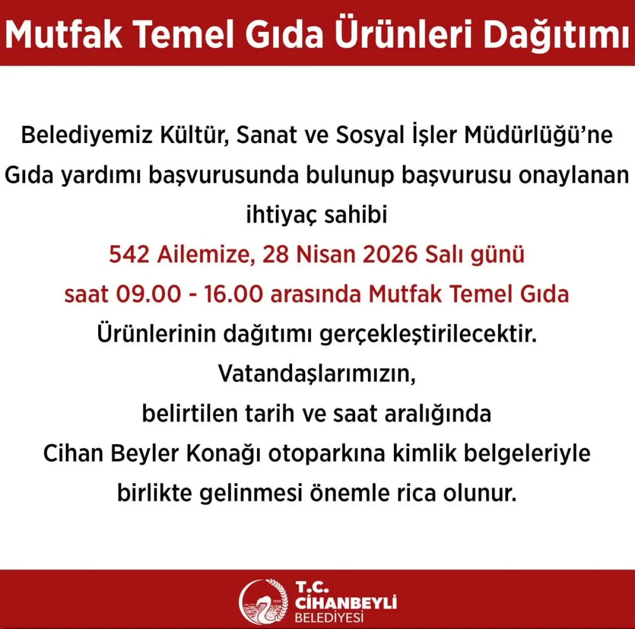 Yardımlardan faydalanacak vatandaşların, belirtilen tarih ve saat aralığında Cihan Beyler Konağı otoparkına kimlik belgeleri ile birlikte gelmeleri gerektiği ifade edildi.