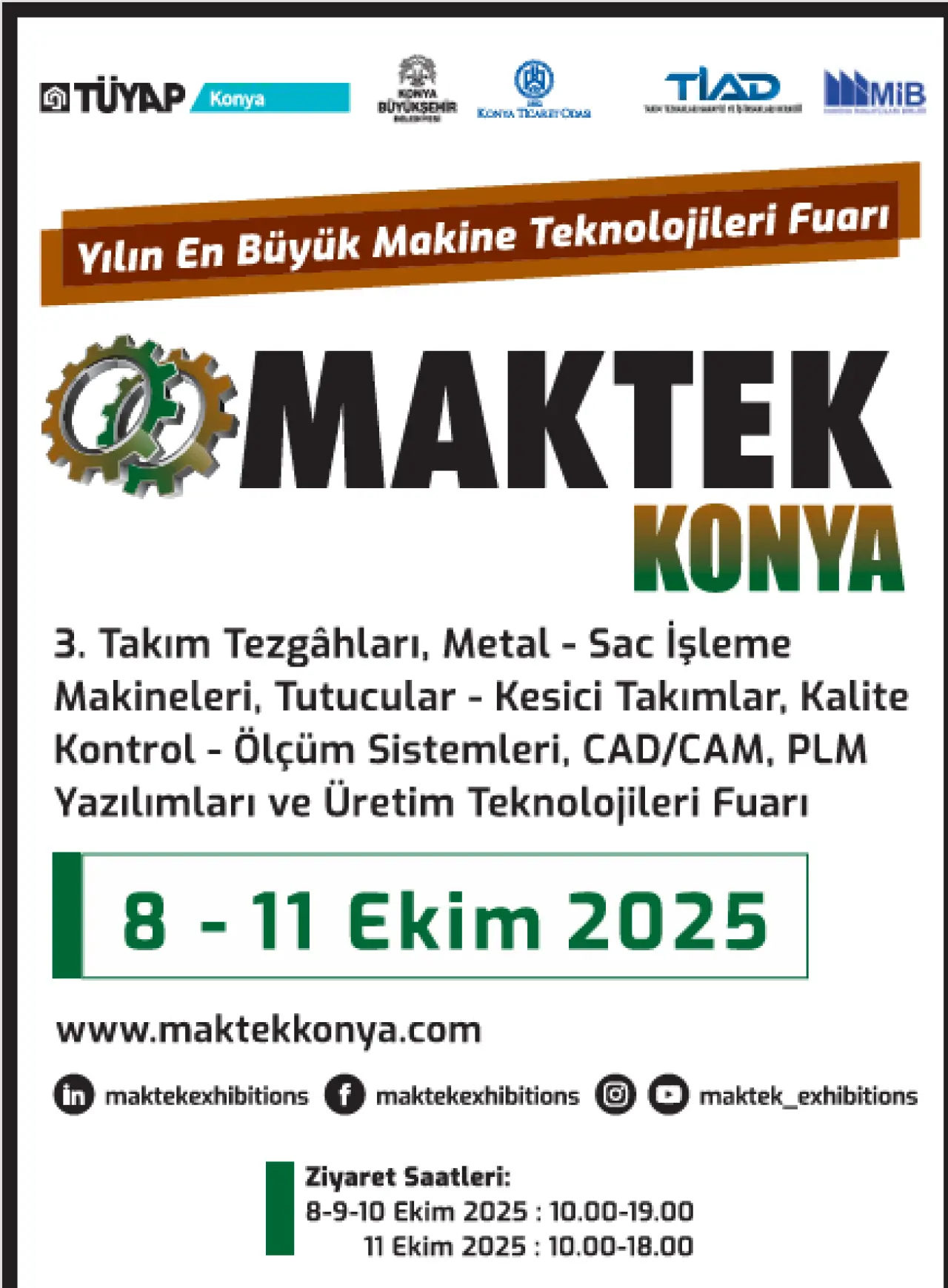 MAKTEK Konya - 3. Takım Tezgâhları, Metal - Sac İşleme Makineleri, Tutucular – Kesici Takımlar, Kalite Kontrol - Ölçüm Sistemleri, CAD/CAM, PLM Yazılımları ve Üretim Teknolojileri Fuarı, 8-11 Ekim 2025 tarihleri arasında Konya Ticaret Odası - Tüyap Konya Uluslararası Fuar Merkezi'nde düzenlenecek. Fuar, Tüyap Fuarcılık Grubu organizasyonuyla, Takım Tezgâhları Sanayici ve İş İnsanları Derneği (TİAD) iş birliğinde, Makine İmalatçıları Birliği (MİB) destekleriyle gerçekleştirilecek.