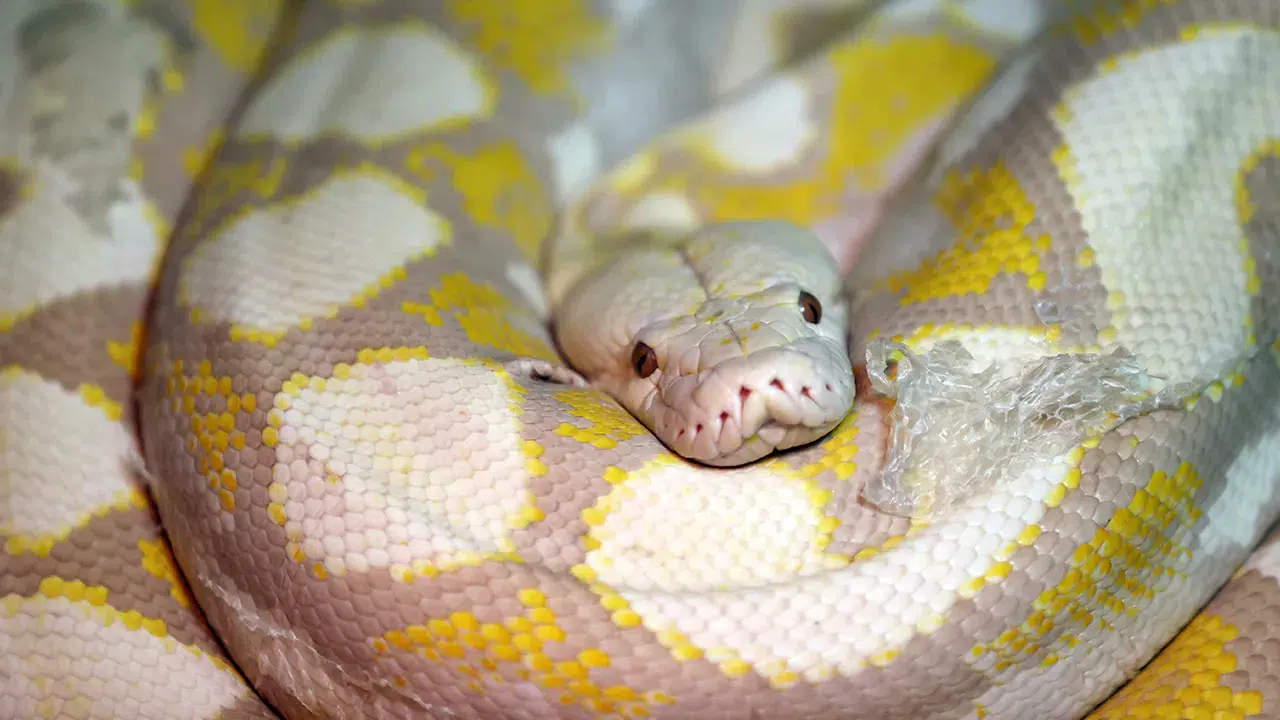 Konya'daki merkezde 3 albino Burma pitonu, türlerinden farklı olarak beyaz-krem tonlarındaki renkleri ve gözleriyle dikkati çekiyor.