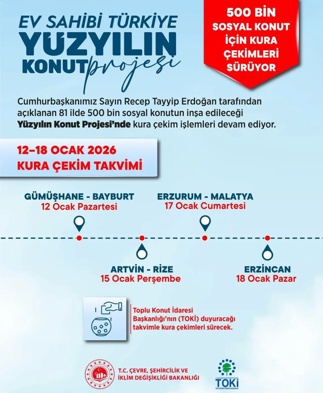 Bakan Kurum, projede 16 ilin kura süreçlerinin tamamlandığını, bu hafta ise 7 şehirde daha kura heyecanının yaşanacağını belirterek, “#EvSahibiTürkiye diyerek yolumuza kararlılıkla devam ediyoruz” ifadelerini kullandı.