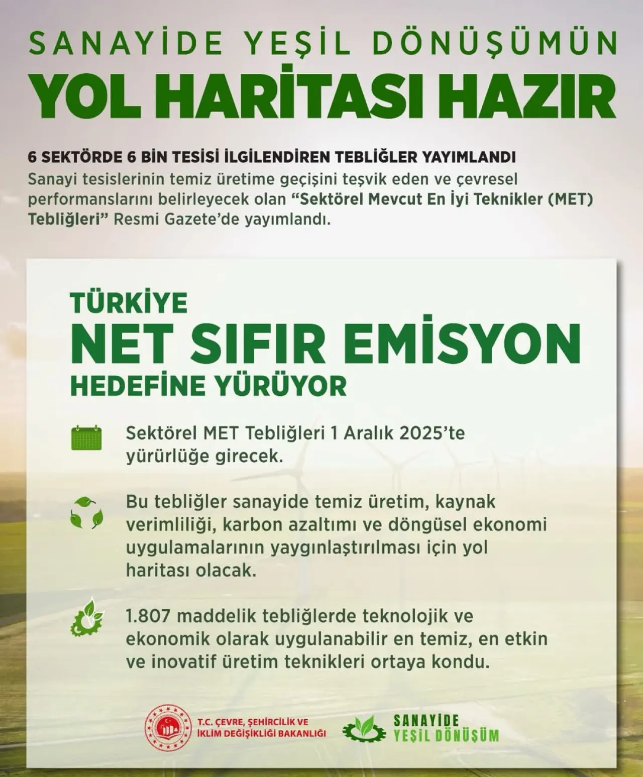 Türkiye, “2053 Net Sıfır Emisyon” hedefleri doğrultusunda sanayide sürdürülebilirlik adına çok önemli bir süreci resmen başlattı. Çevre, Şehircilik ve İklim Değişikliği Bakanı, Konyalı Murat Kurum tarafından yapılan açıklamada; temiz üretim teknolojileri, döngüsel ekonomi uygulamaları ve karbon azaltımını önceleyen yeni kararların 1 Aralık itibariyle yürürlüğe girdiği duyuruldu.