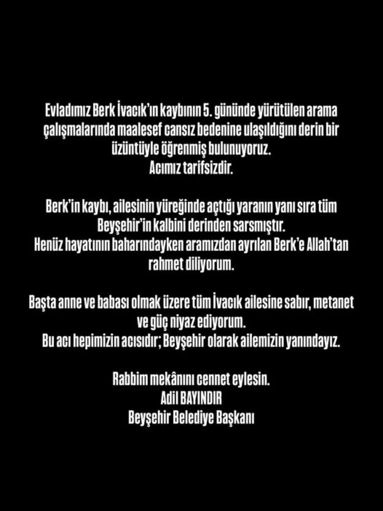 “Evladımız Berk İvacık’ın kaybının 5. gününde yürütülen arama çalışmalarında maalesef cansız bedenine ulaşıldığını derin bir üzüntüyle öğrenmiş bulunuyoruz. Acımız tarifsizdir. Berk’in kaybı, ailesinin yüreğinde açtığı yaranın yanı sıra tüm Beyşehir’in kalbini derinden sarsmıştır. Henüz hayatının baharındayken aramızdan ayrılan Berk’e Allah’tan rahmet diliyorum. Başta anne ve babası olmak üzere tüm İvacık ailesine sabır, metanet ve güç niyaz ediyorum. Bu acı hepimizin acısıdır; Beyşehir olarak ailemizin yanındayız. Rabbim mekânını cennet eylesin.”