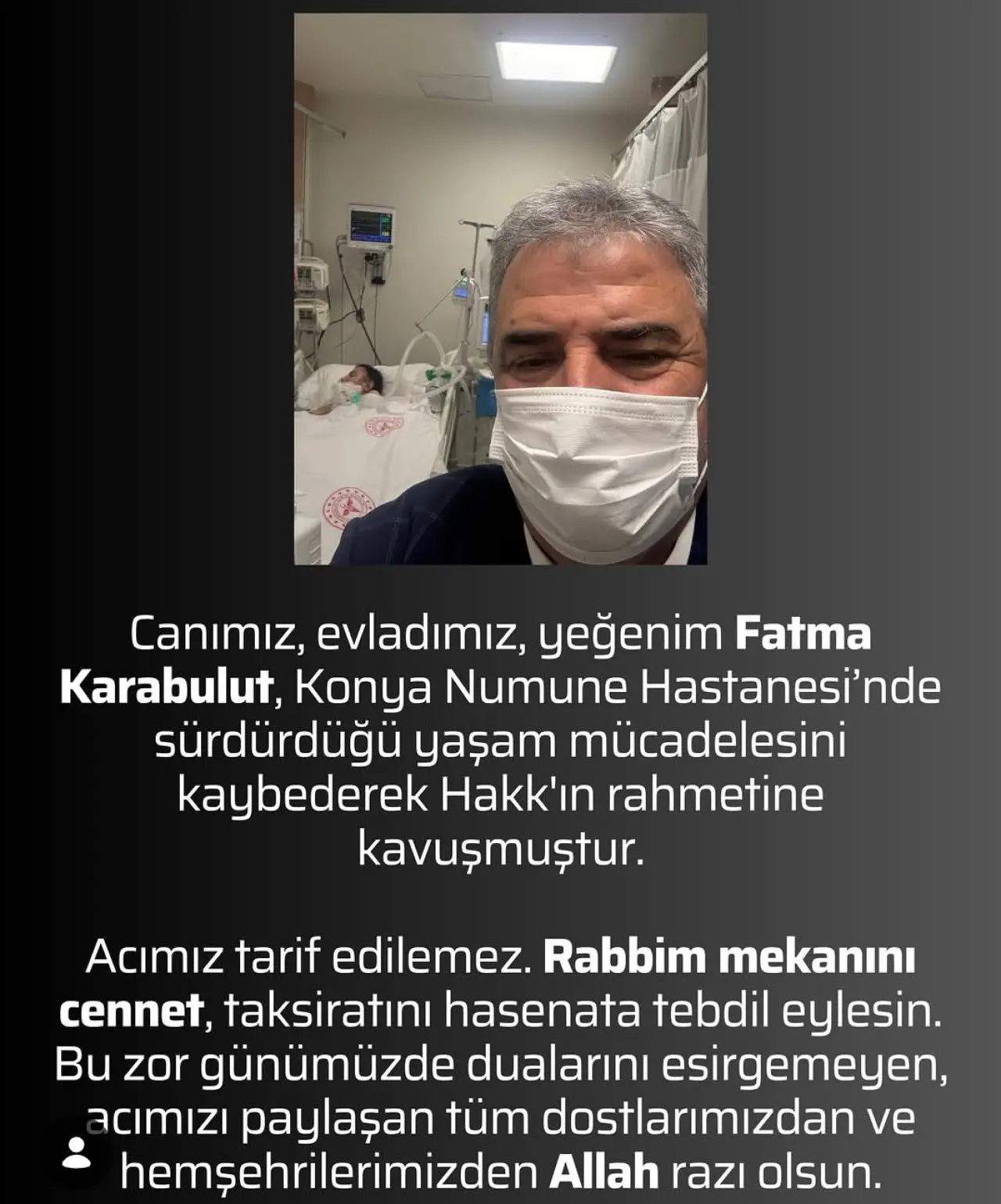 Başkan Karabulut paylaşımında, “Canımız, evladımız, yeğenim Fatma Karabulut, Konya Numune Hastanesi’nde sürdürdüğü yaşam mücadelesini kaybederek Hakk’ın rahmetine kavuşmuştur.” ifadelerine yer verdi.