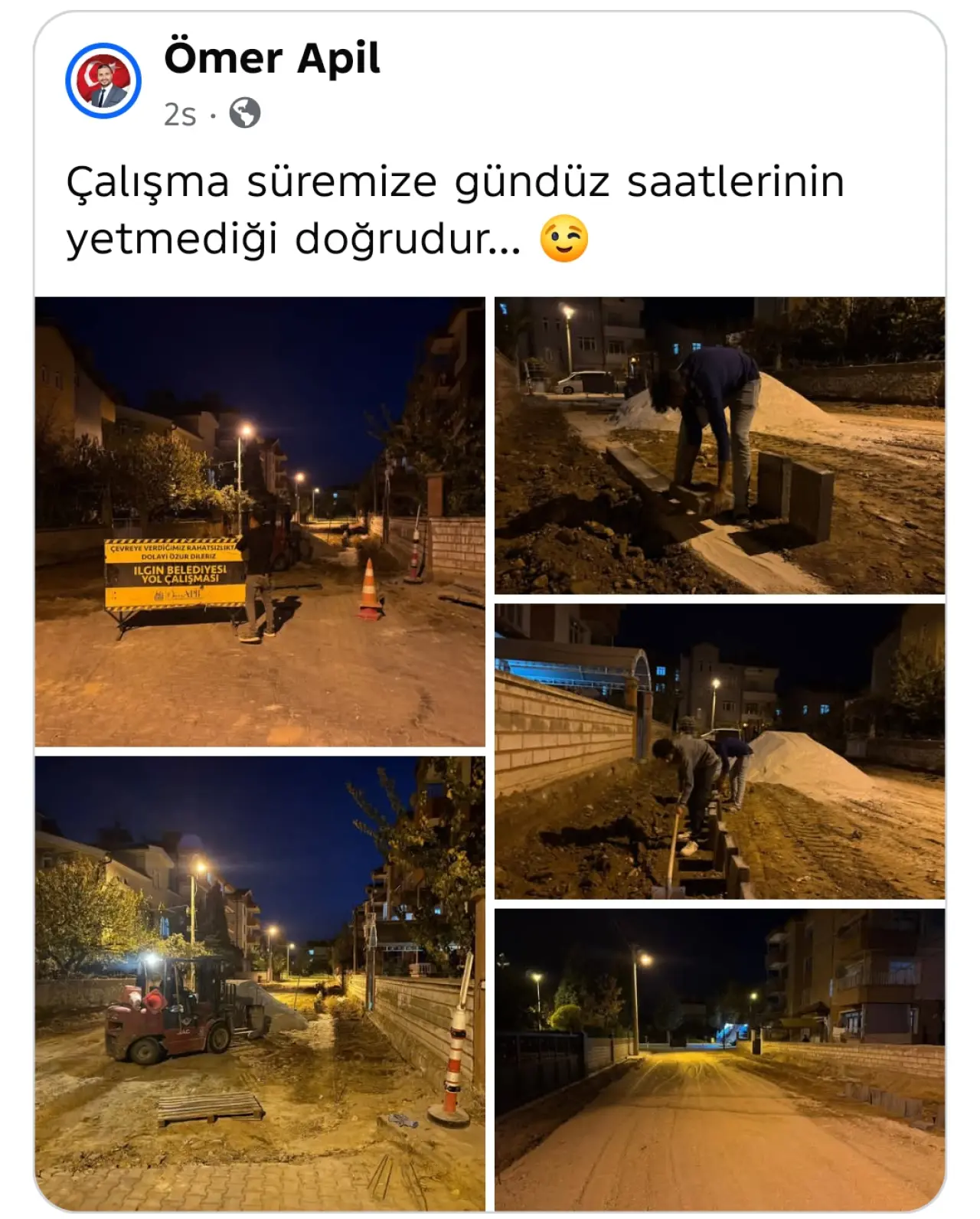 Ilgın Belediye Başkanı Ömer Apil, belediye ekiplerinin sahadaki yoğun çalışmalarına ilişkin dikkat çekici bir paylaşımda bulundu. Çalışma temposunun yüksekliğine vurgu yapan Başkan Apil, “Çalışma süremize gündüz saatlerinin yetmediği doğrudur... 😉” ifadeleriyle hem tebessüm ettiren hem de hizmet kararlılığını ortaya koyan bir mesaj paylaştı.