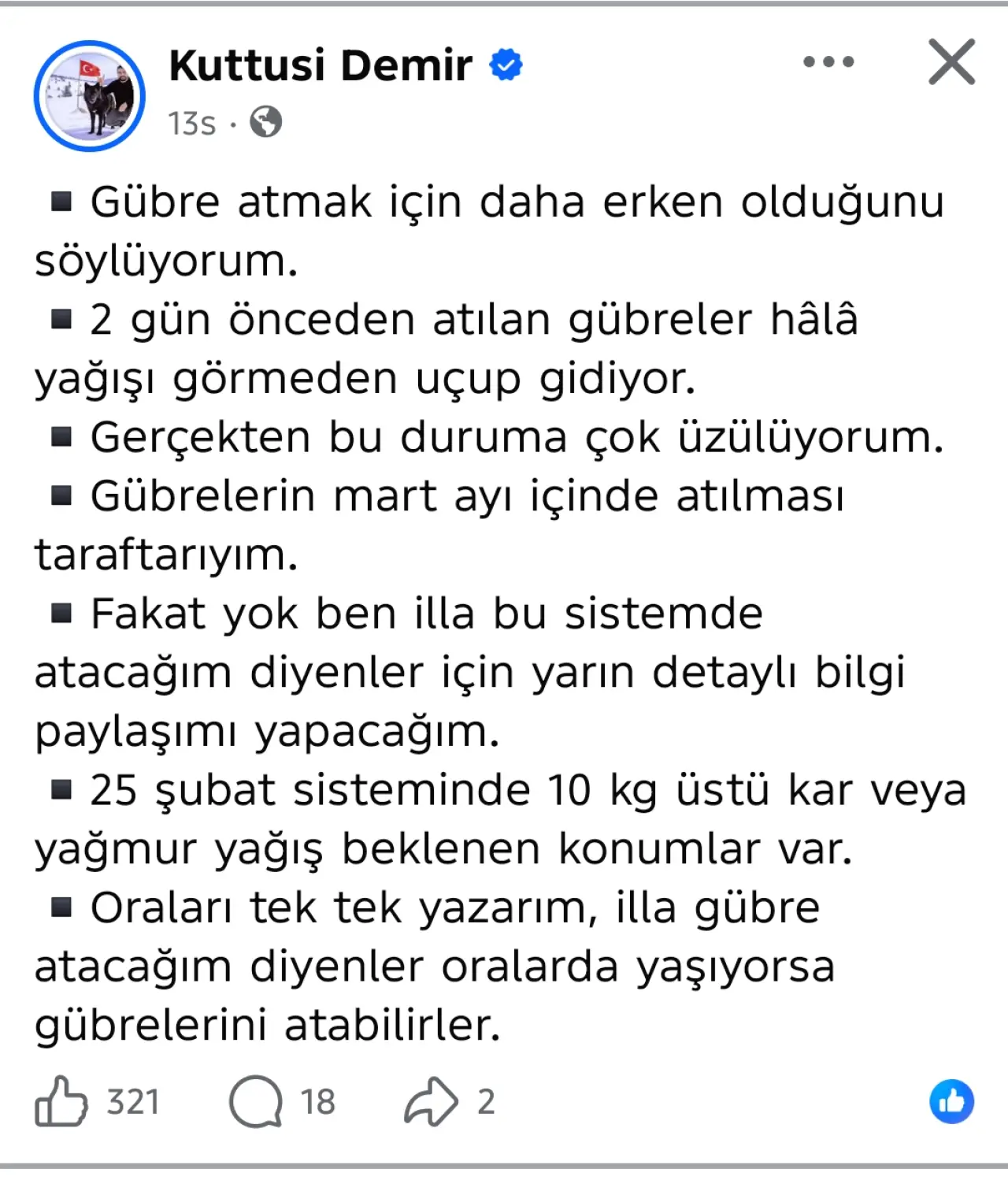 Öte yandan 25 Şubat tarihinde etkili olması beklenen hava sistemiyle ilgili de bilgi paylaşan Demir, bazı bölgelerde 10 kilogramın üzerinde kar veya yağmur yağışı beklendiğini ifade etti. “İlla bu sistemde atacağım diyenler için yarın detaylı bilgi paylaşımı yapacağım. 25 Şubat sisteminde 10 kg üstü kar veya yağmur yağış beklenen konumlar var. Oraları tek tek yazarım, o bölgelerde yaşayanlar gübrelerini atabilirler.” dedi.