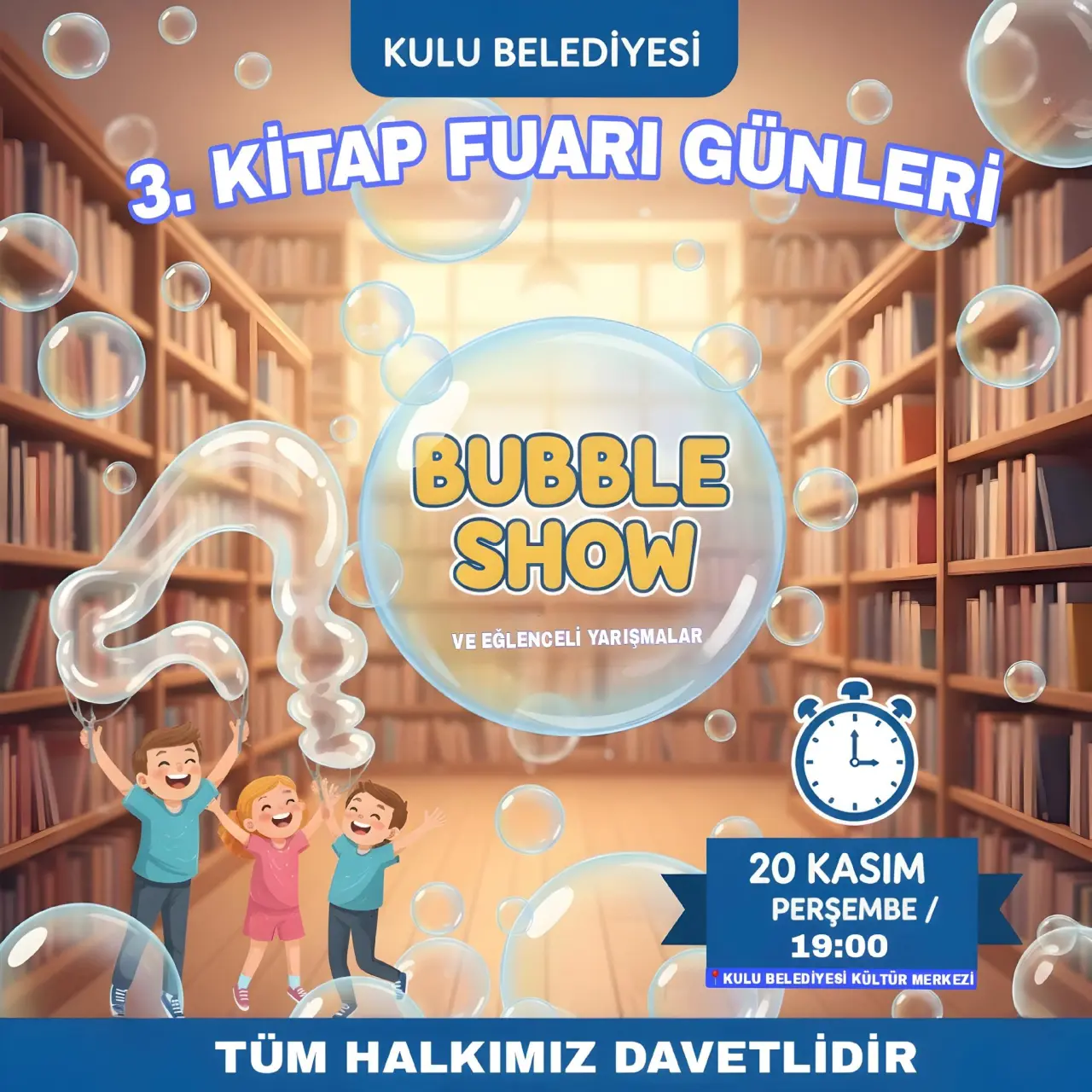 Kulu Belediyesi tarafından düzenlenen 3. Kitap Fuarı Günleri, dolu dolu etkinliklerle hız kesmeden devam ediyor. Fuar kapsamında bu akşam, özellikle çocuklar için hazırlanan renkli ve eğlenceli bir Bubble Show programı gerçekleştirilecek.