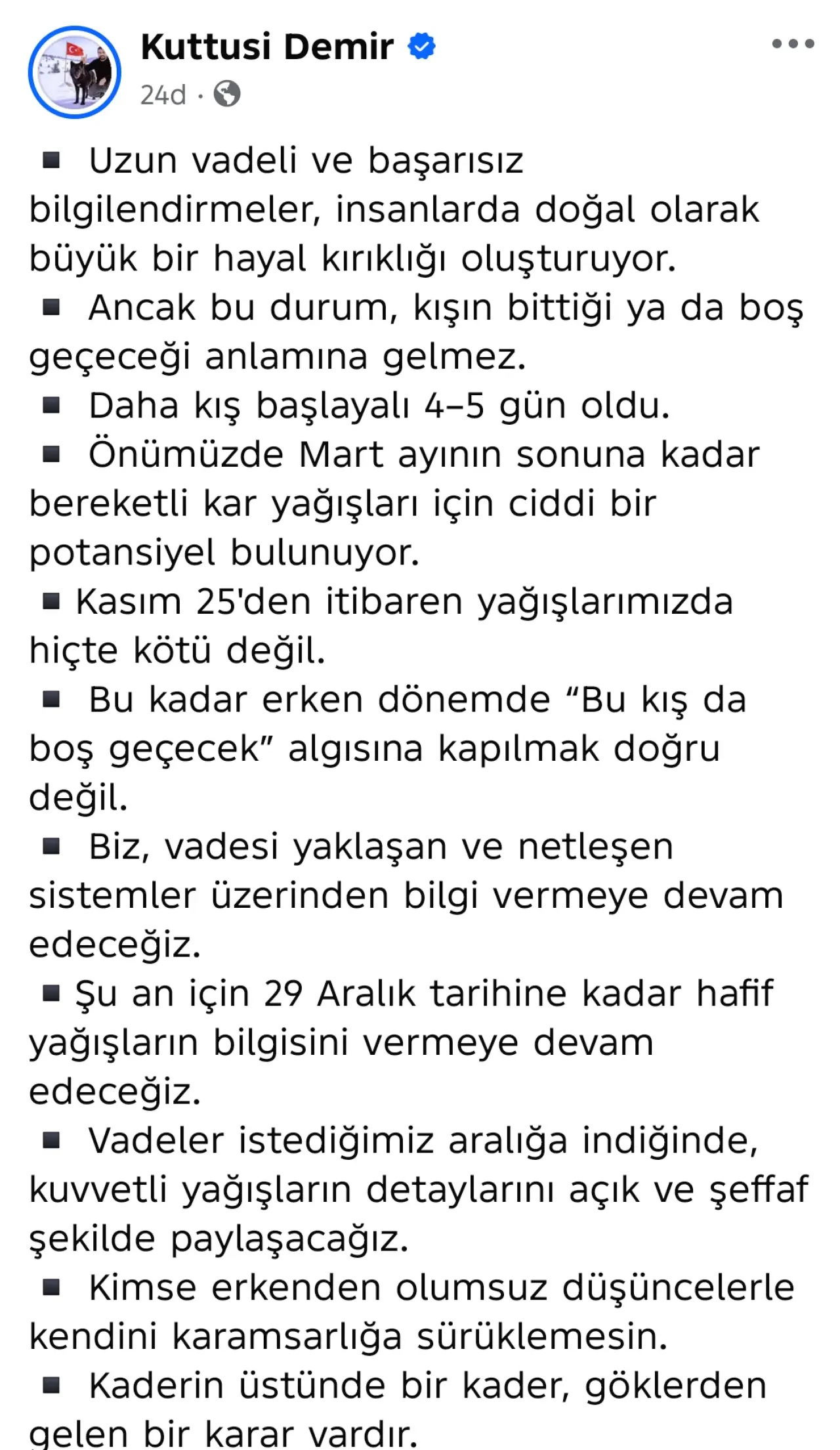 Kış mevsiminin henüz yeni başladığına dikkat çeken Demir, “Daha kış başlayalı 4–5 gün oldu. Bu durum, kışın bittiği ya da boş geçeceği anlamına gelmez” ifadelerini kullandı. Önümüzdeki sürece işaret eden Demir, Mart ayının sonuna kadar bereketli kar yağışları için ciddi bir potansiyel bulunduğunu belirtti.