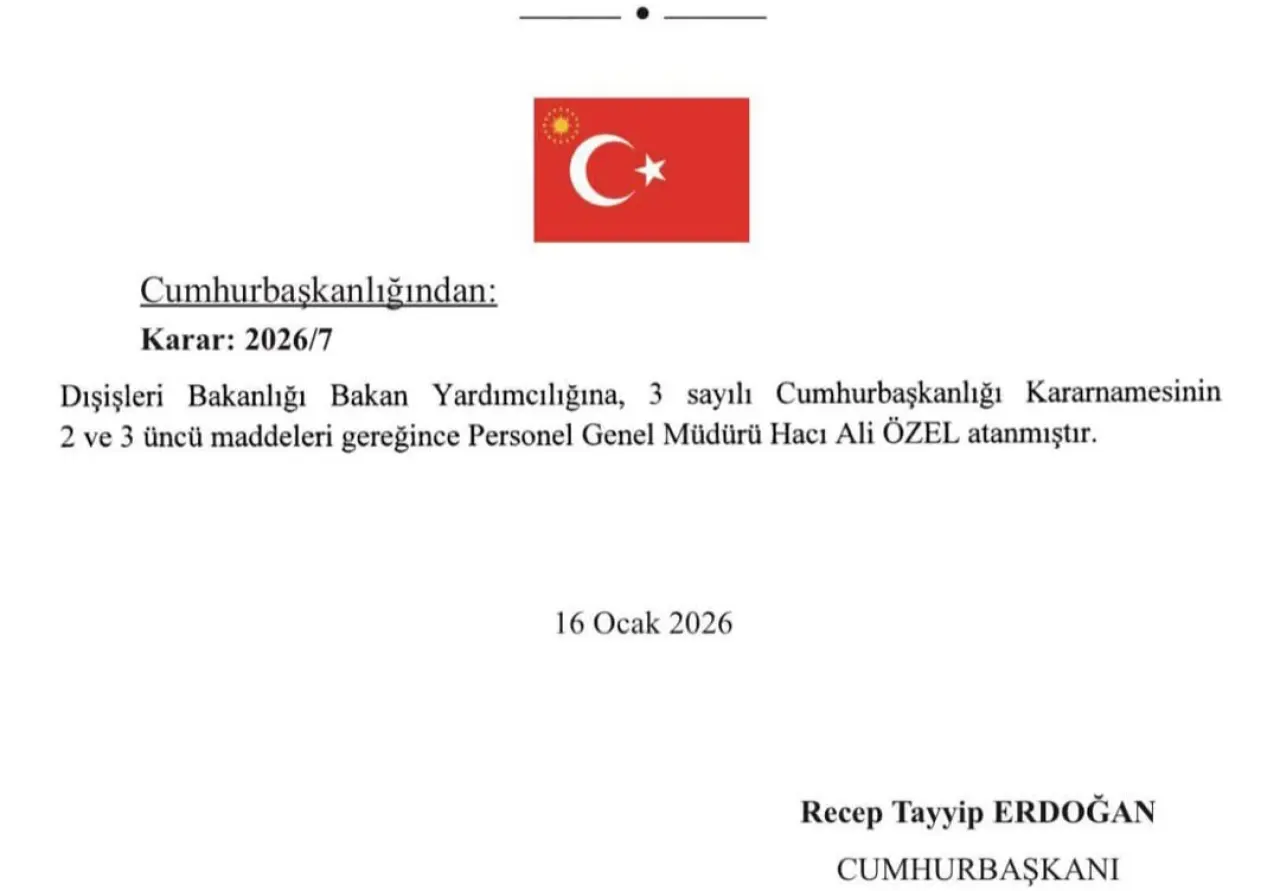 Cumhurbaşkanı Recep Tayyip Erdoğan’ın imzasıyla Resmi Gazete’de yayımlanan atama kararıyla, Dışişleri Bakanlığı Personel Genel Müdürü Hacı Ali Özel, Dışişleri Bakan Yardımcılığı görevine atandı. Böylece Dışişleri Bakanı Hakan Fidan’ın yeni yardımcısı Konyalı bir isim oldu.