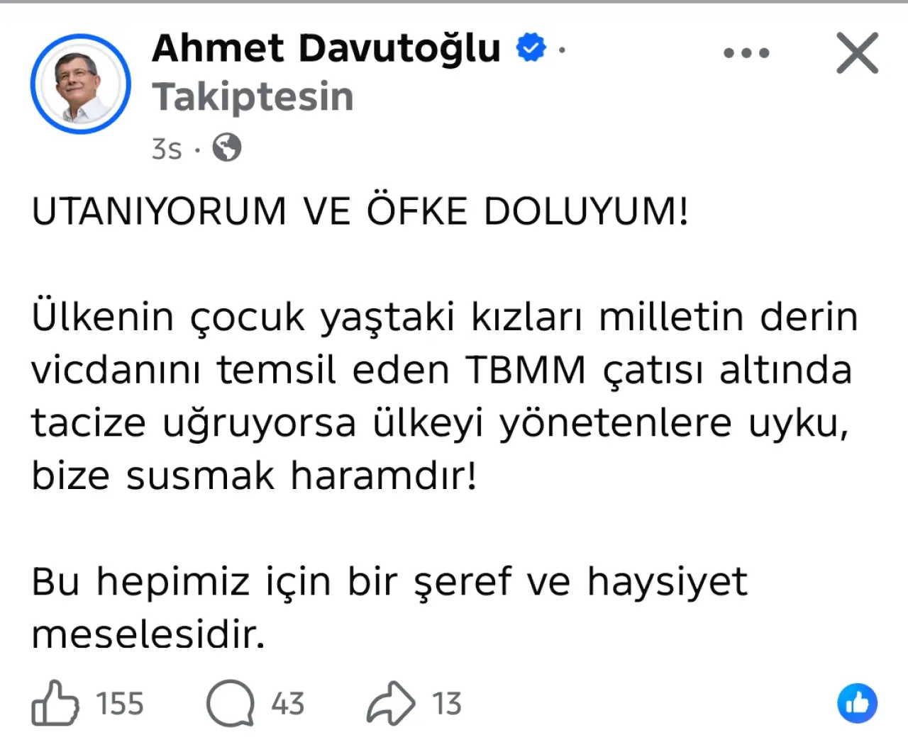 “Utaniyorum ve öfke doluyum! Ülkenin çocuk yaştaki kızları, milletin derin vicdanını temsil eden TBMM çatısı altında tacize uğruyorsa, ülkeyi yönetenlere uyku, bize susmak haramdır! Bu hepimiz için bir şeref ve haysiyet meselesidir.”