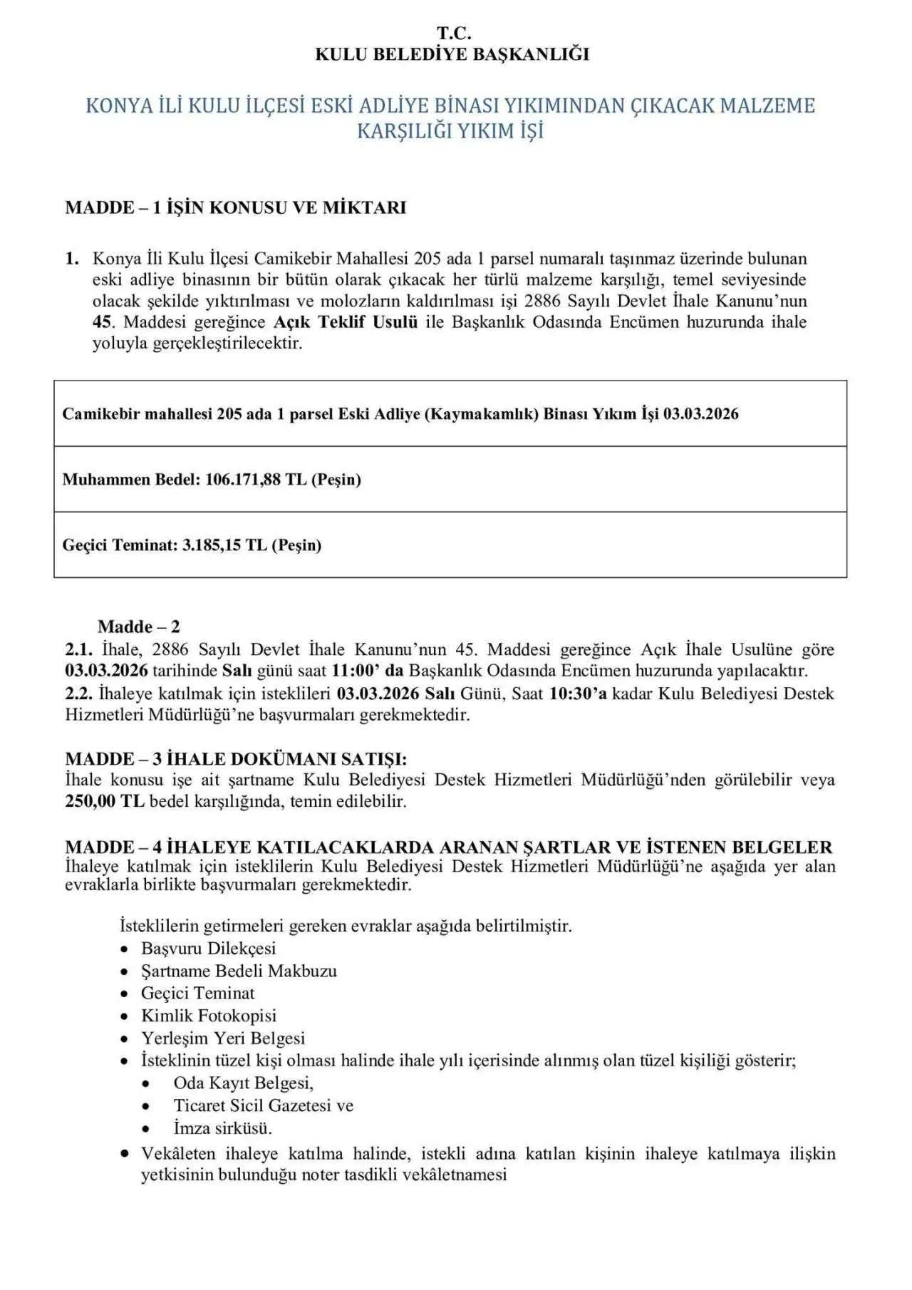İhale kapsamında bina, temel seviyesine kadar yıkılacak ve ortaya çıkan molozlar yüklenici firma tarafından kaldırılacak. Yıkım işi, 2886 Sayılı Devlet İhale Kanunu’nun 45. maddesi gereğince Açık Teklif Usulü ile gerçekleştirilecek. İhalenin, Belediye Başkanlık Odası’nda Encümen huzurunda yapılacağı bildirildi.