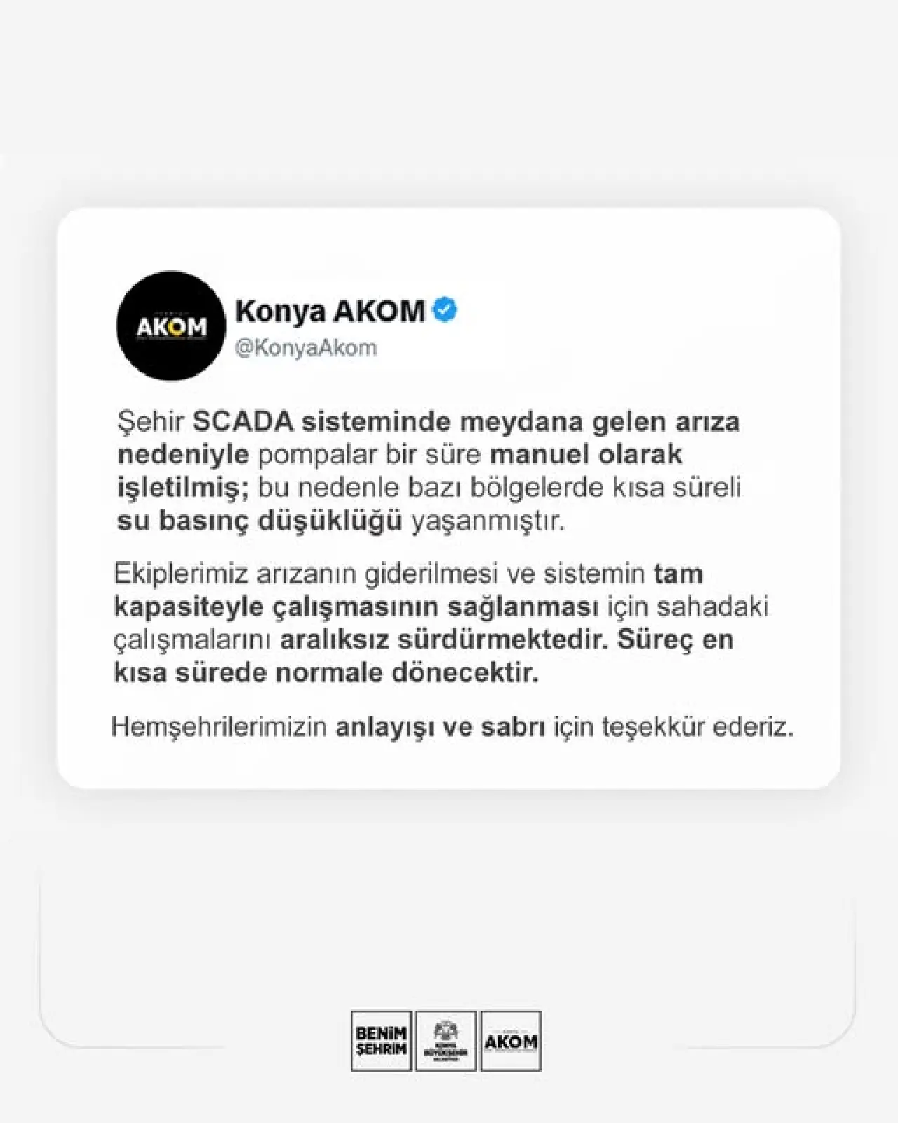 AKOM’dan yapılan açıklamada şu ifadelere yer verildi: “Şehir SCADA sisteminde meydana gelen arıza nedeniyle pompalarımız bir süre manuel olarak işletilmek zorunda kalmış, bu süreçte bazı bölgelerimizde kısa süreli su basınç düşüklüğü yaşanmıştır. Ekiplerimiz arızanın giderilmesi ve sistemin tam kapasiteyle çalışmasının sağlanması için sahadaki çalışmalarını aralıksız sürdürmektedir. Hemşehrilerimizin göstermiş oldukları anlayış ve sabır için teşekkür ederiz.”