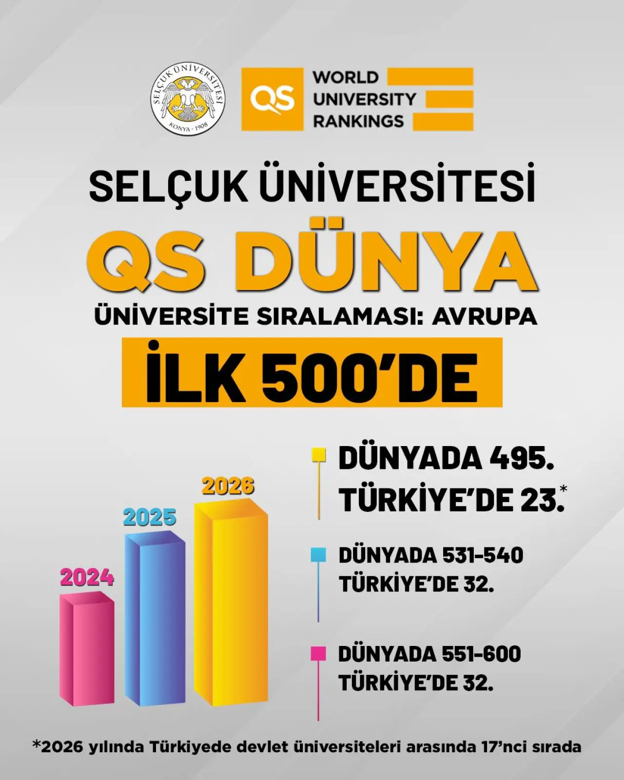 Selçuk Üniversitesi, QS Dünya Üniversite Sıralaması Avrupa sonuçlarında ilk 500 üniversite arasında yer alarak akademik üretim gücünü, araştırma kapasitesini ve uluslararası alandaki yükselen konumunu bir kez daha tescilledi.