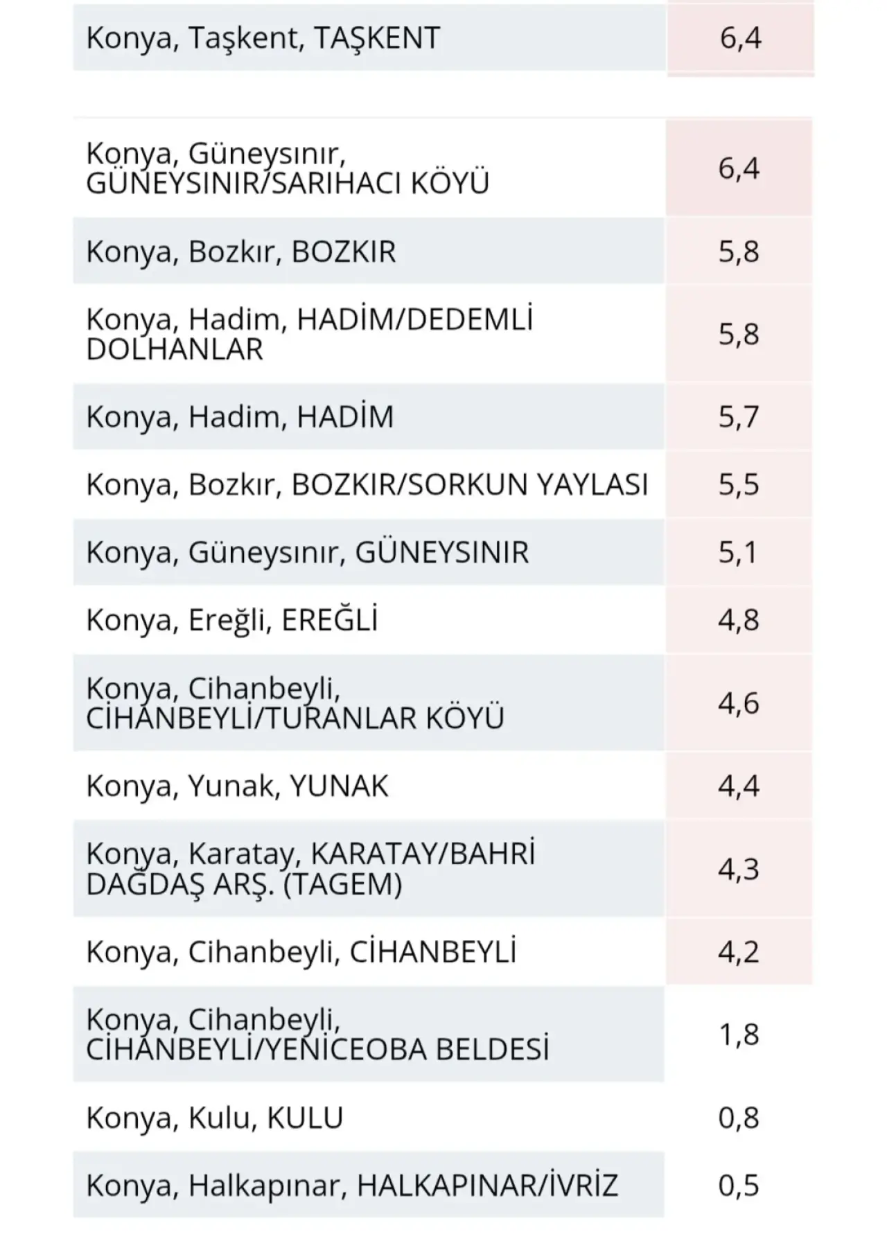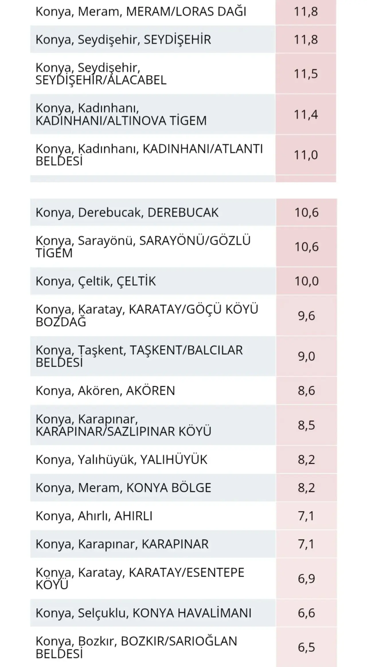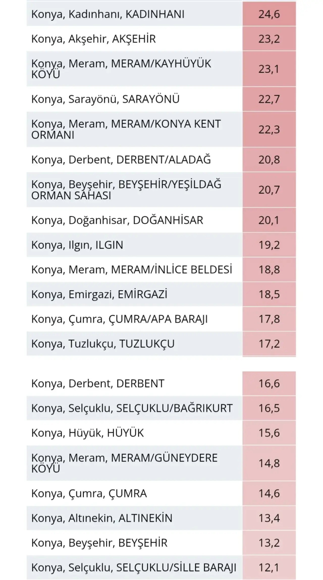Yağışın en yoğun hissedildiği ilçeler arasında Kadınhanı ve Akşehir ön plana çıktı. Kadınhanı’nda metrekareye düşen 24,6 kg yağış, şehrin en yüksek miktarı olarak kaydedilirken, Akşehir 23,2 kg ile ikinci sırada yer aldı. Meram ilçesine bağlı Kayhüyük Köyü ise 23,1 kg ile listenin üst sıralarında yer aldı.