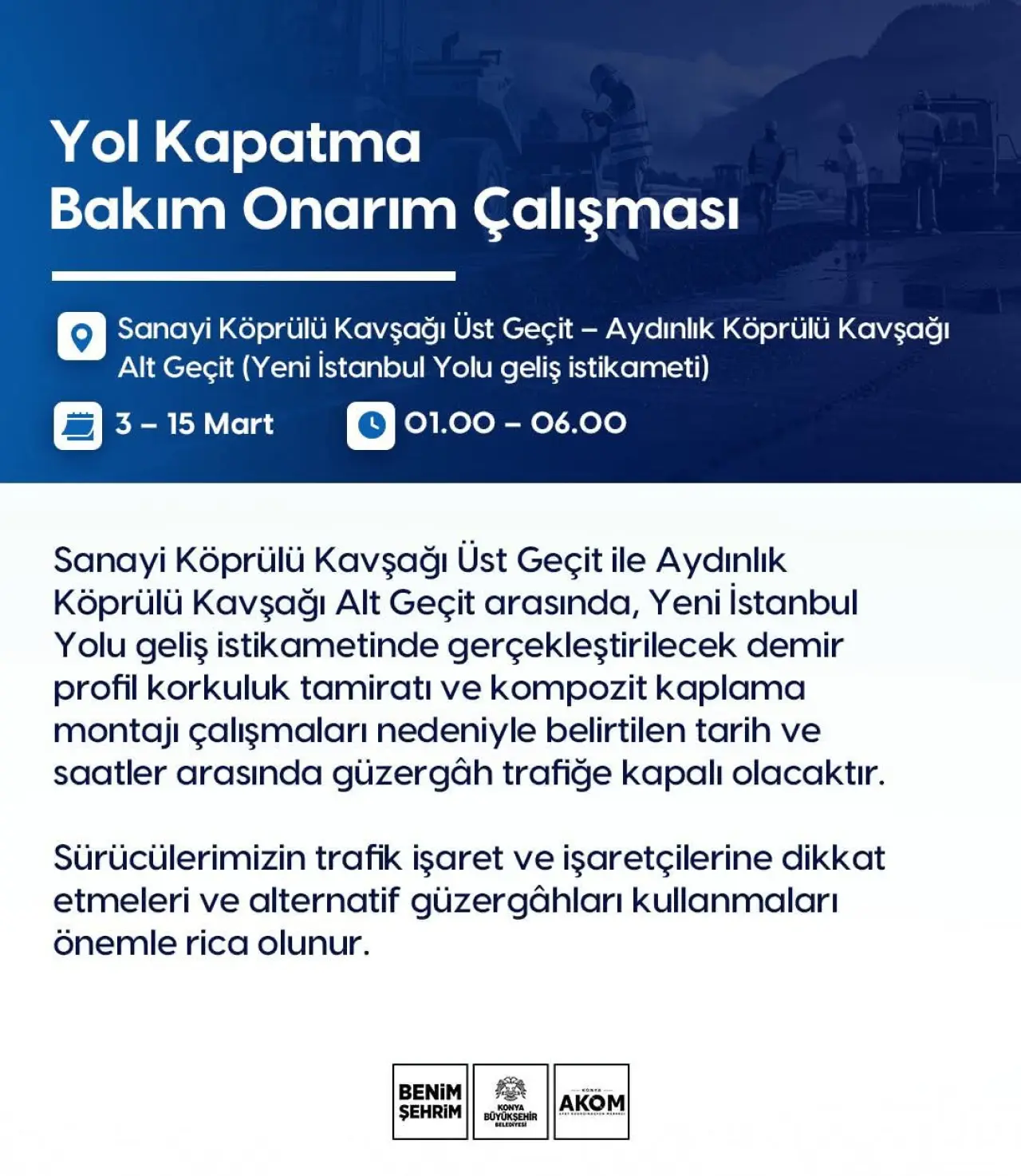 Konya’da sürücüler dikkat .. Konya AKOM tarafından yapılan açıklamaya göre, Sanayi Köprülü Kavşağı Üst Geçit ile Aydınlık Köprülü Kavşağı Alt Geçit arasında, Yeni İstanbul Yolu geliş istikametinde bakım ve onarım çalışmaları gerçekleştirilecek.